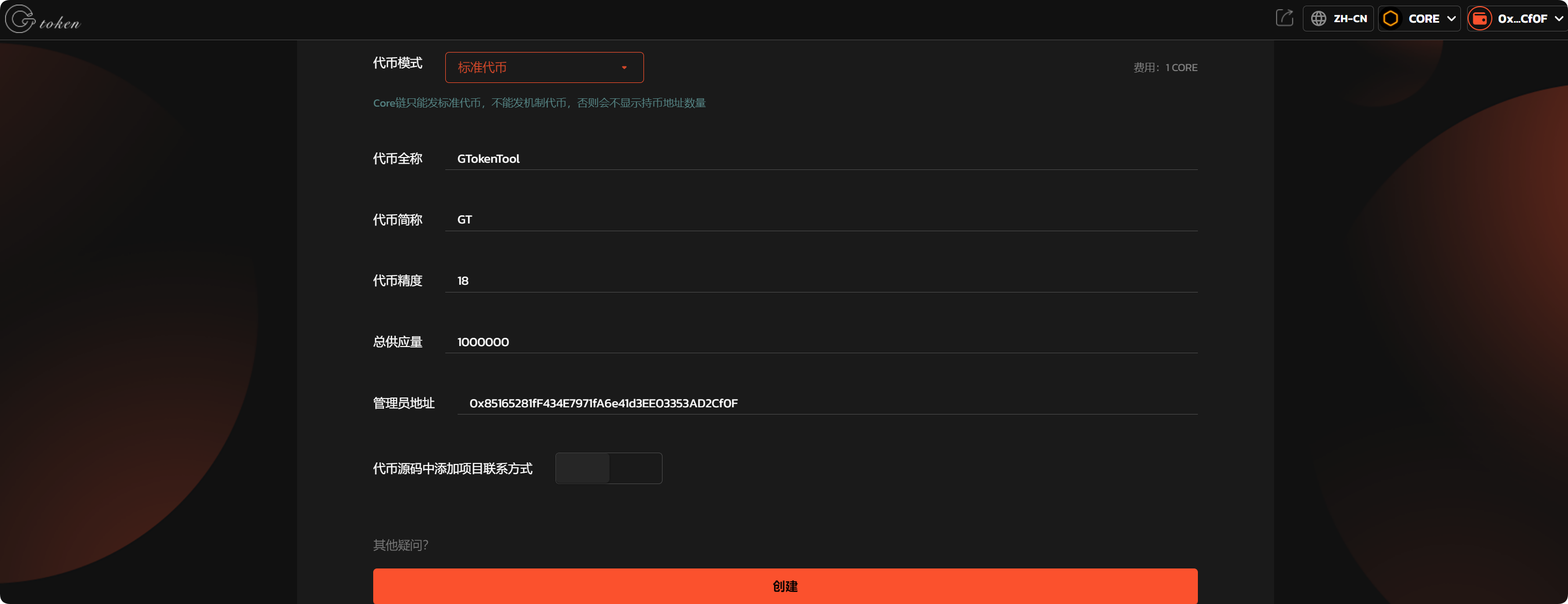 依次填写代币信息，假设我们创建一个代币叫——“GTokenTool”，填写如下：