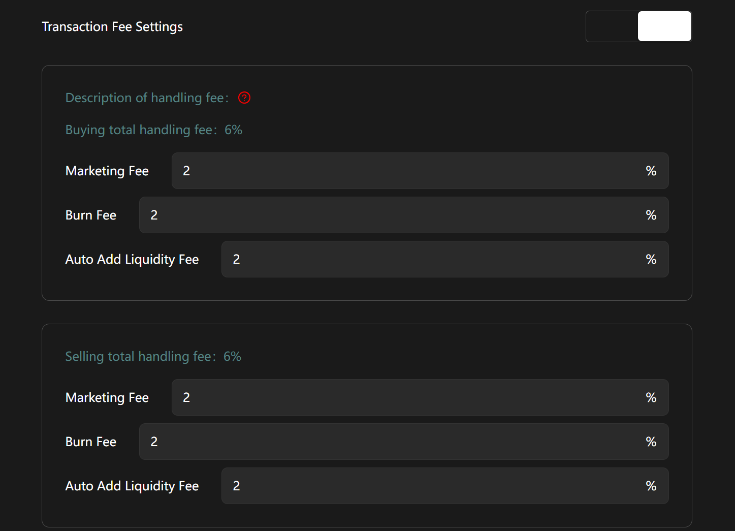 * **Transfer Fee (Optional):** Equal to Buy Fee or Equal to Sell Fee.