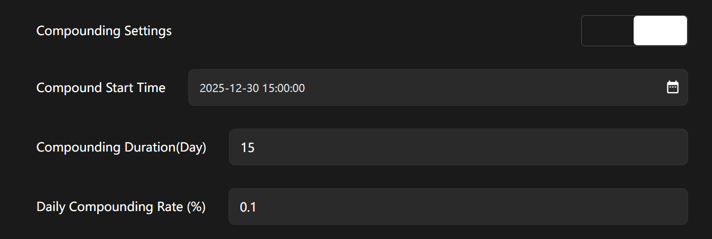 * **Compounding Settings:** Set up start time and duration and daily compounding rate.