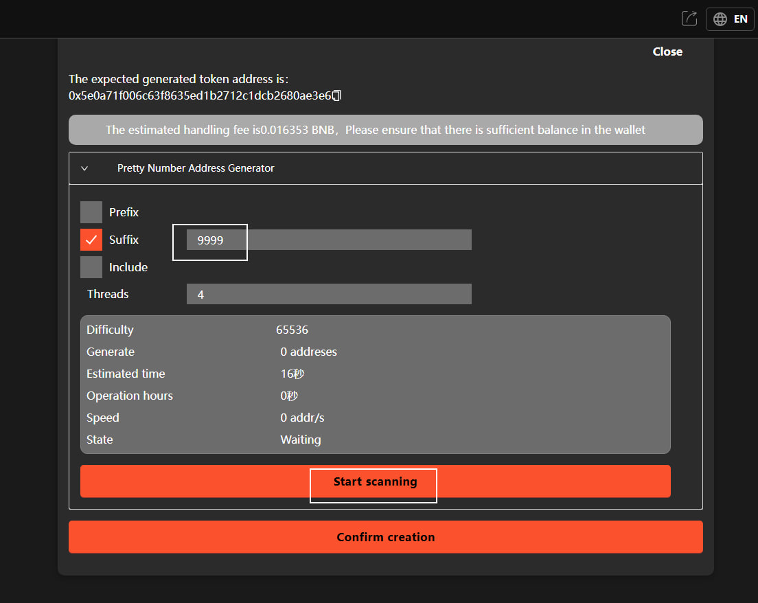3. Enter your desired vanity address pattern—you can choose either a prefix or suffix. Here, I select the suffix "9999" and click "Scan".