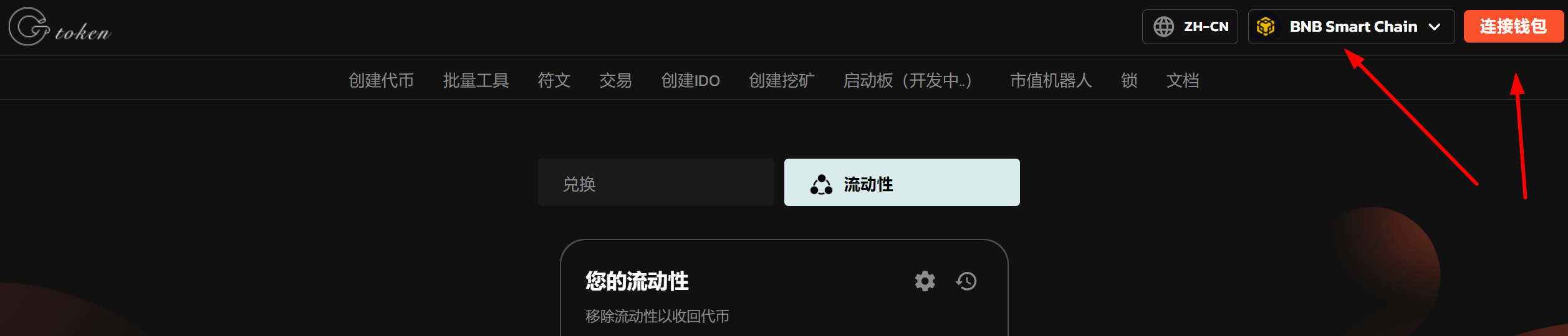 Enter the page: <https://gtokentool.com/liquidity>，Click on the upper right corner, connect to MetaMask Wallet, and switch to the main network (using BSC test network as an example).