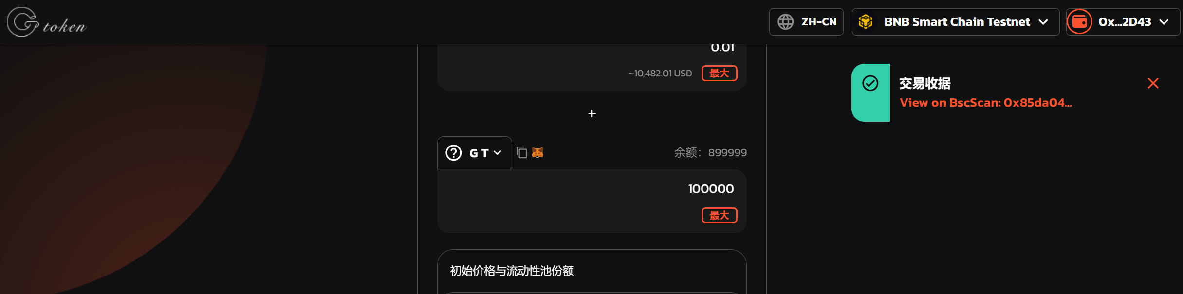 （The meaning is 0.01 TBNB = 100000 G T）