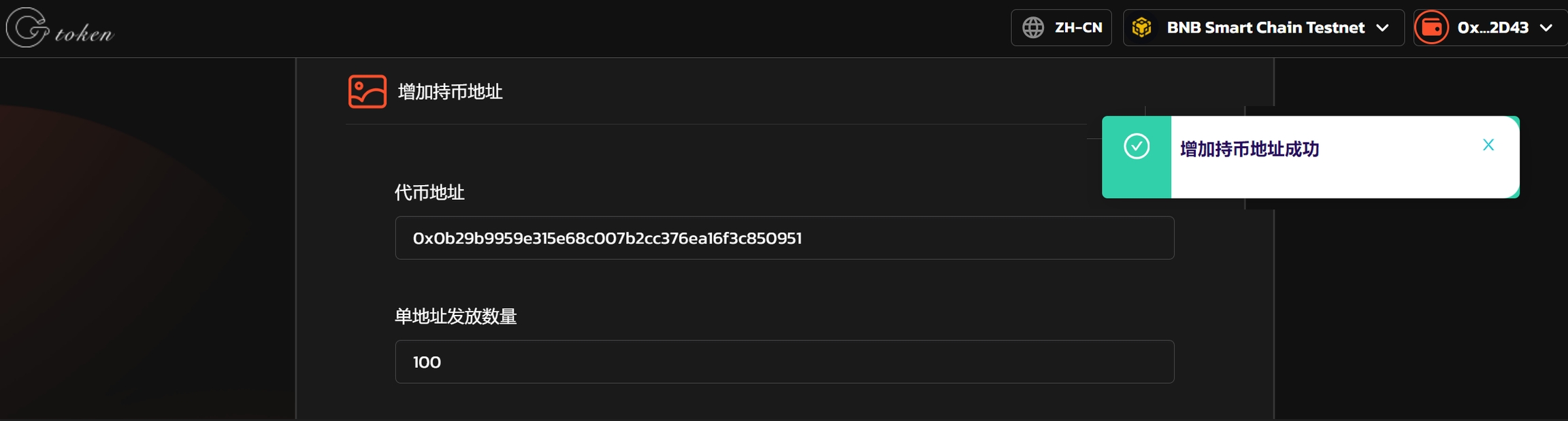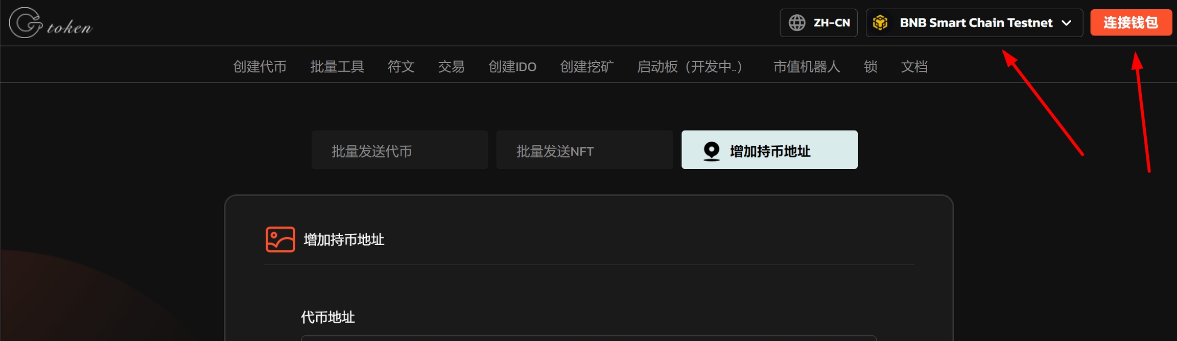 Enter the page: https://gtokentool.com/increaseAddr,Click on the upper right corner, connect to MetaMask Wallet, and switch to the main network (using BSC test network as an example).