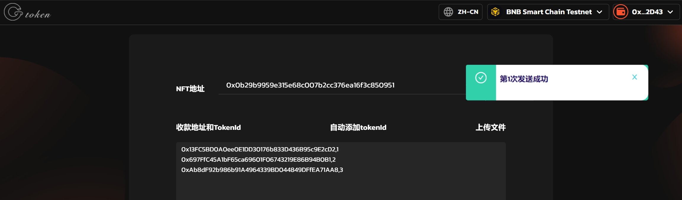 Enter the page: https://gtokentool.com/sendernft,Click on the upper right corner, connect to MetaMask Wallet, and switch to the main network (using BSC test network as an example).