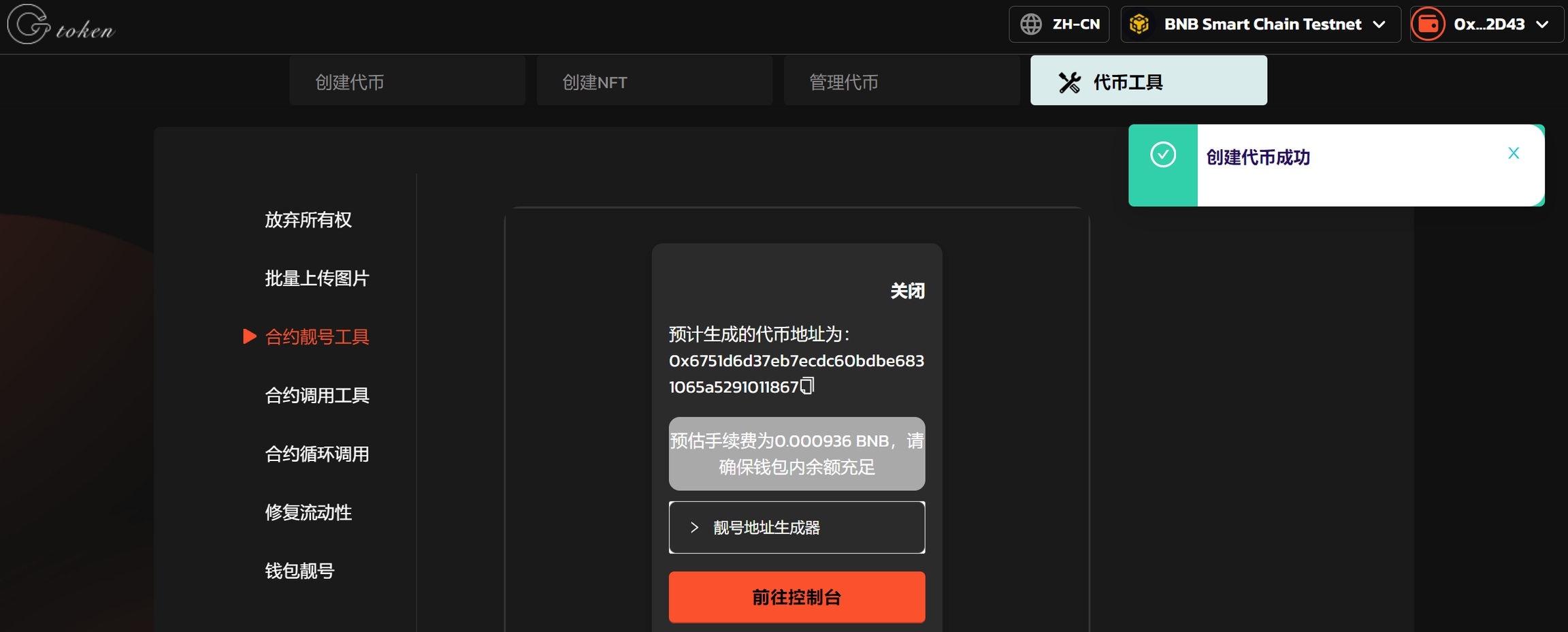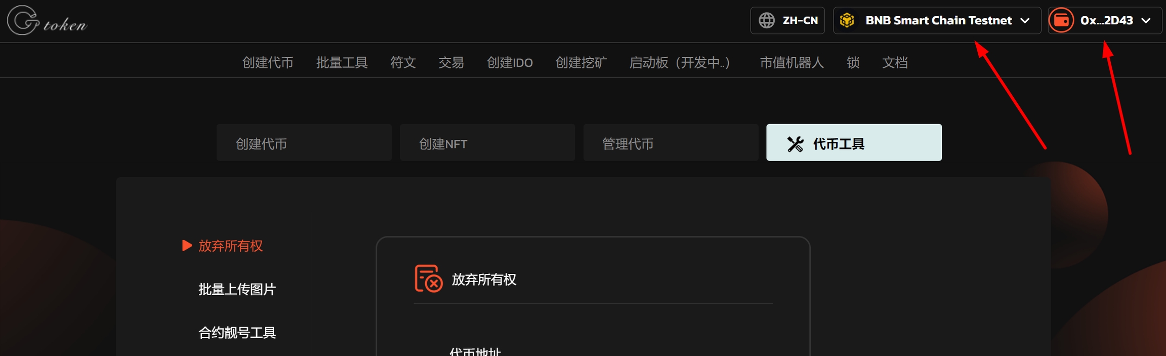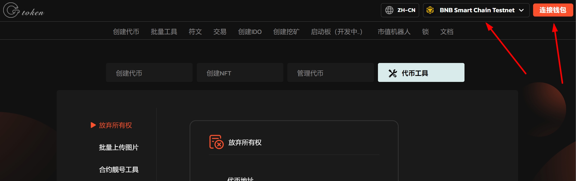 Enter the page: https://gtokentool.com/tool,Click on the upper right corner, connect to MetaMask Wallet, and switch to the main network (using BSC test network as an example).