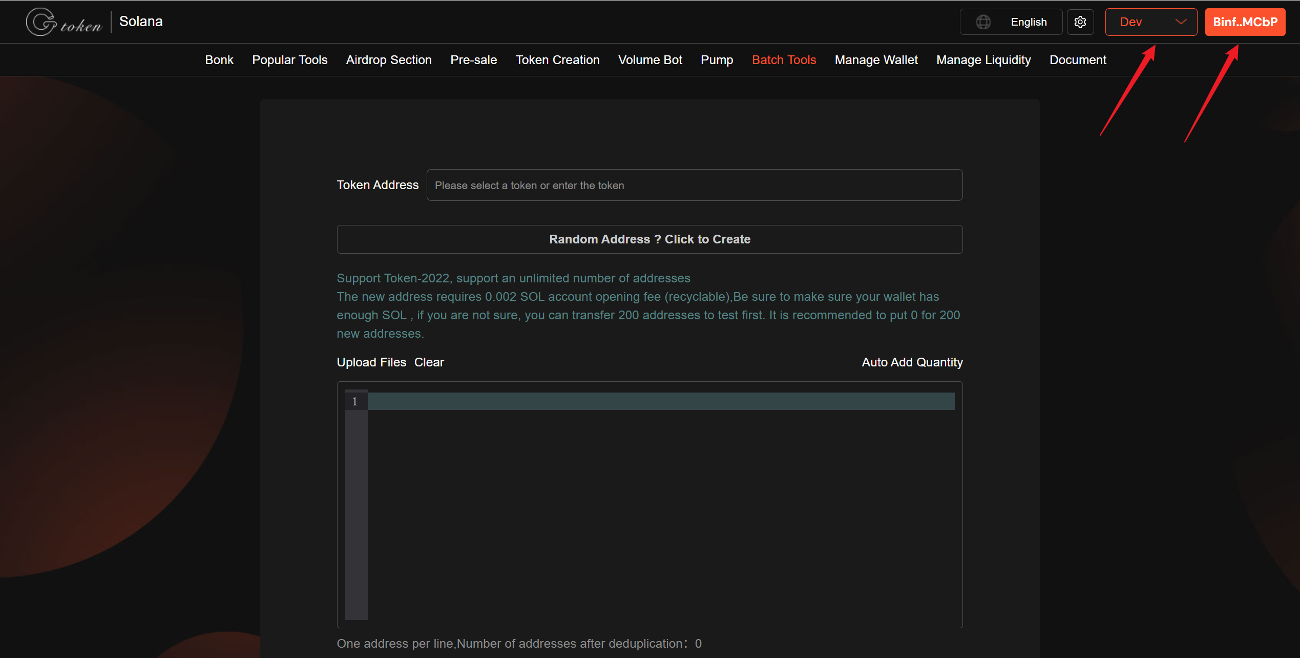 Enter the address in the input box or click "Random Address ? Click to Create" to create wallet address (no more than 20 addresses).