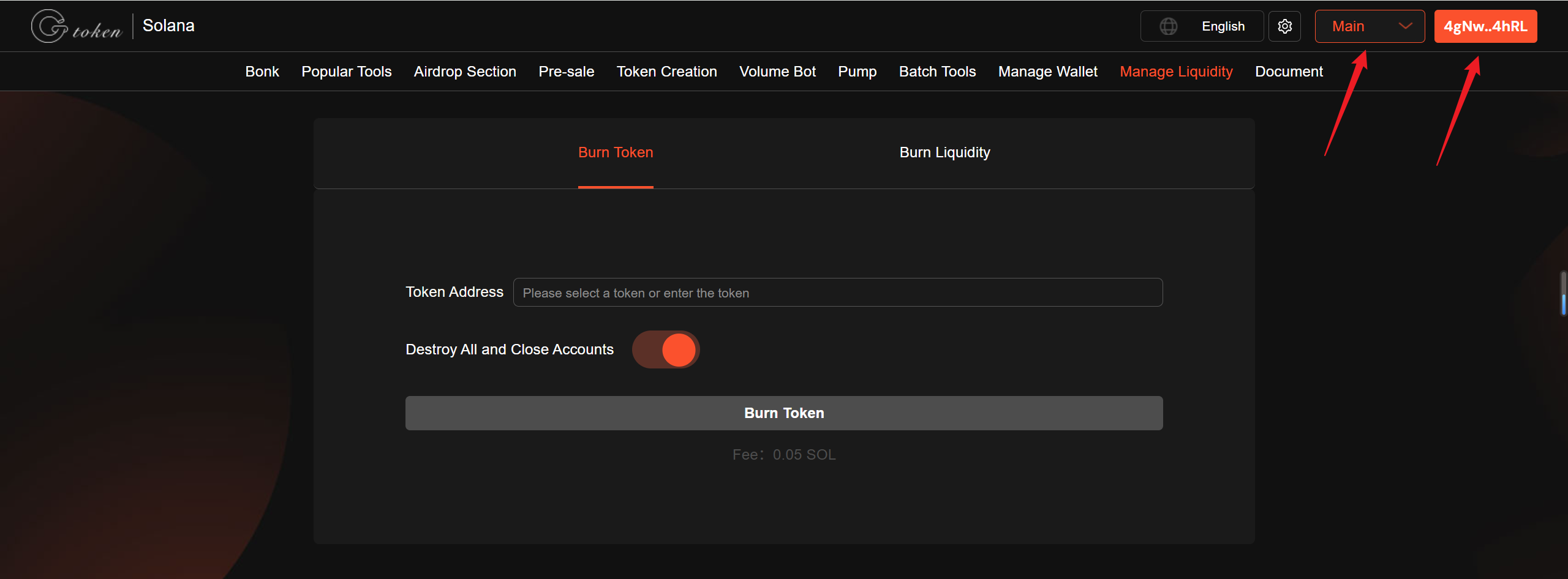 Enter the GTokenTool Burn liquidity page. The upper right corner supports language switching and connect the wallet. Then, select <mark style="color:purple;">Main</mark> network.&#x20;
