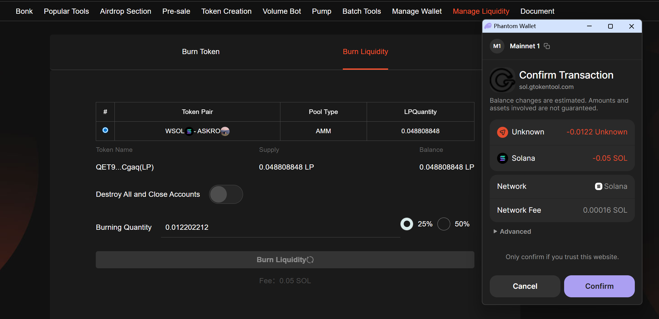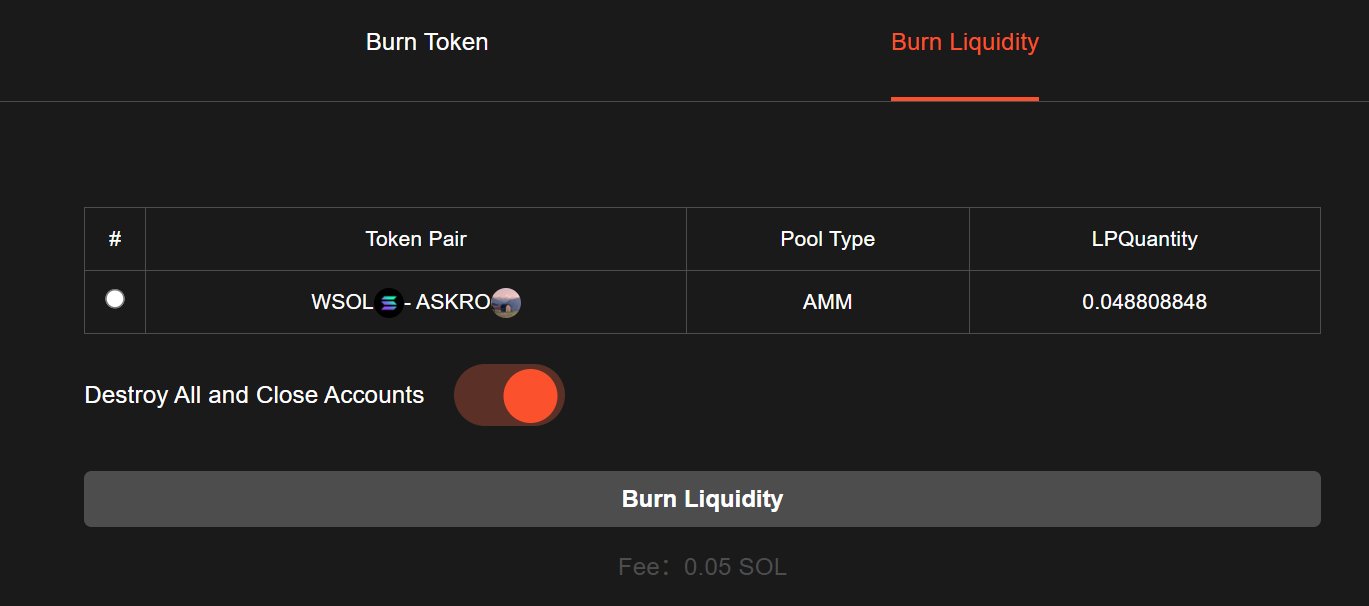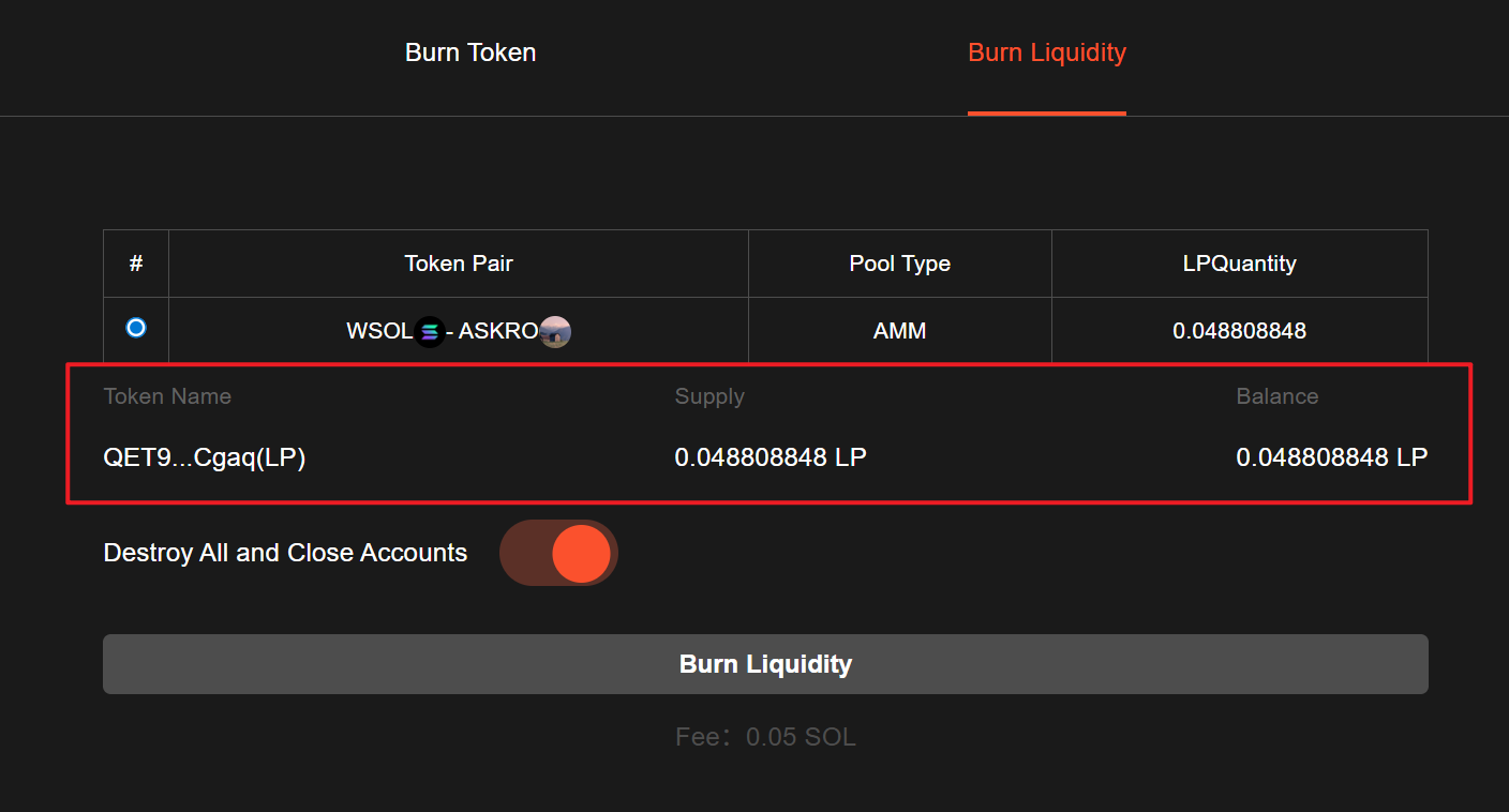 Burn liquidity link: <https://sol.gtokentool.com/en/liquidityManagement/burnToken>