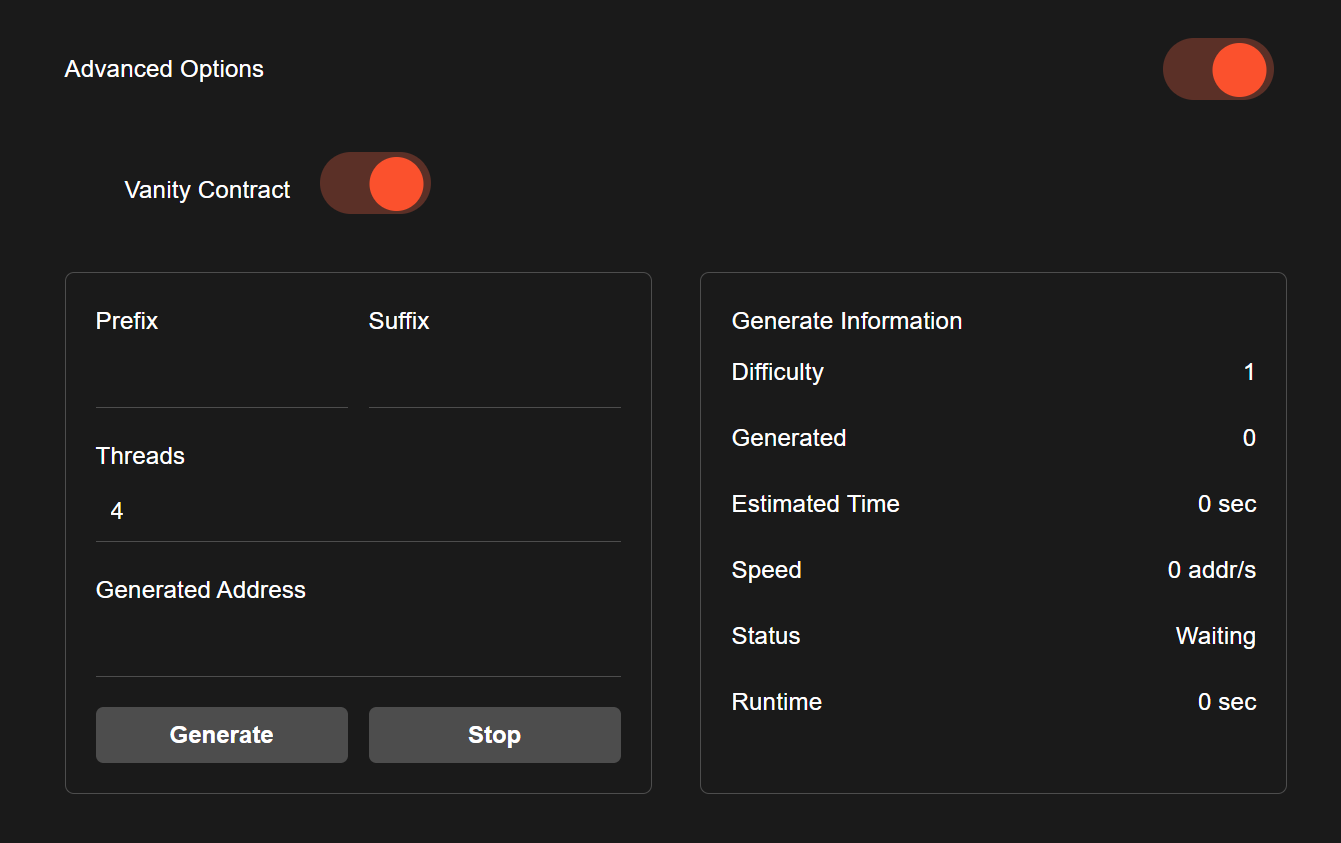 **Vanity Contract**: If you want to customize the token contract, use the vanity contract to create the token.