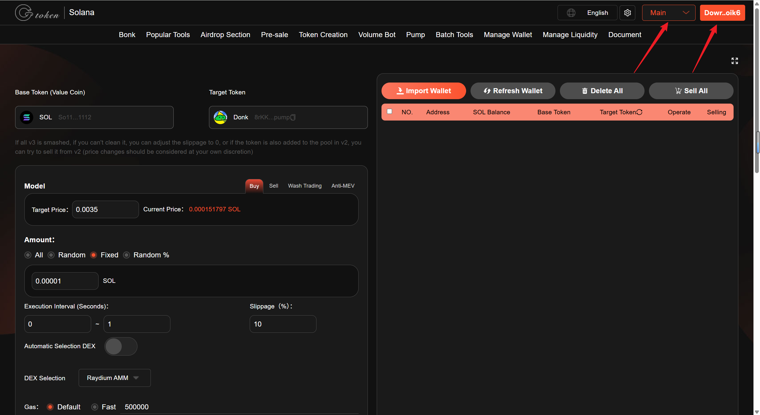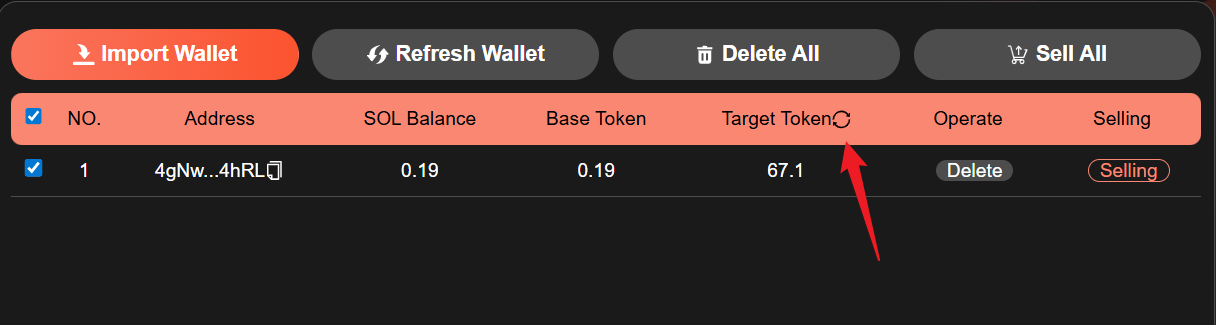 Click "`Import Wallet`" to import wallet, then click "`Refresh Wallet`" to refresh the wallet balance. After checking the wallet, clicking "`Sell All`" allows you to directly sell all the target tokens in the selected wallet. If you do not want to use a wallet, you can click the "`Delete`" button to delete the wallet. Click "`Selling`" to sell all the target tokens in the wallet. Clicking the `refresh icon` next to the target token can refresh the balance of the target token in the wallet.