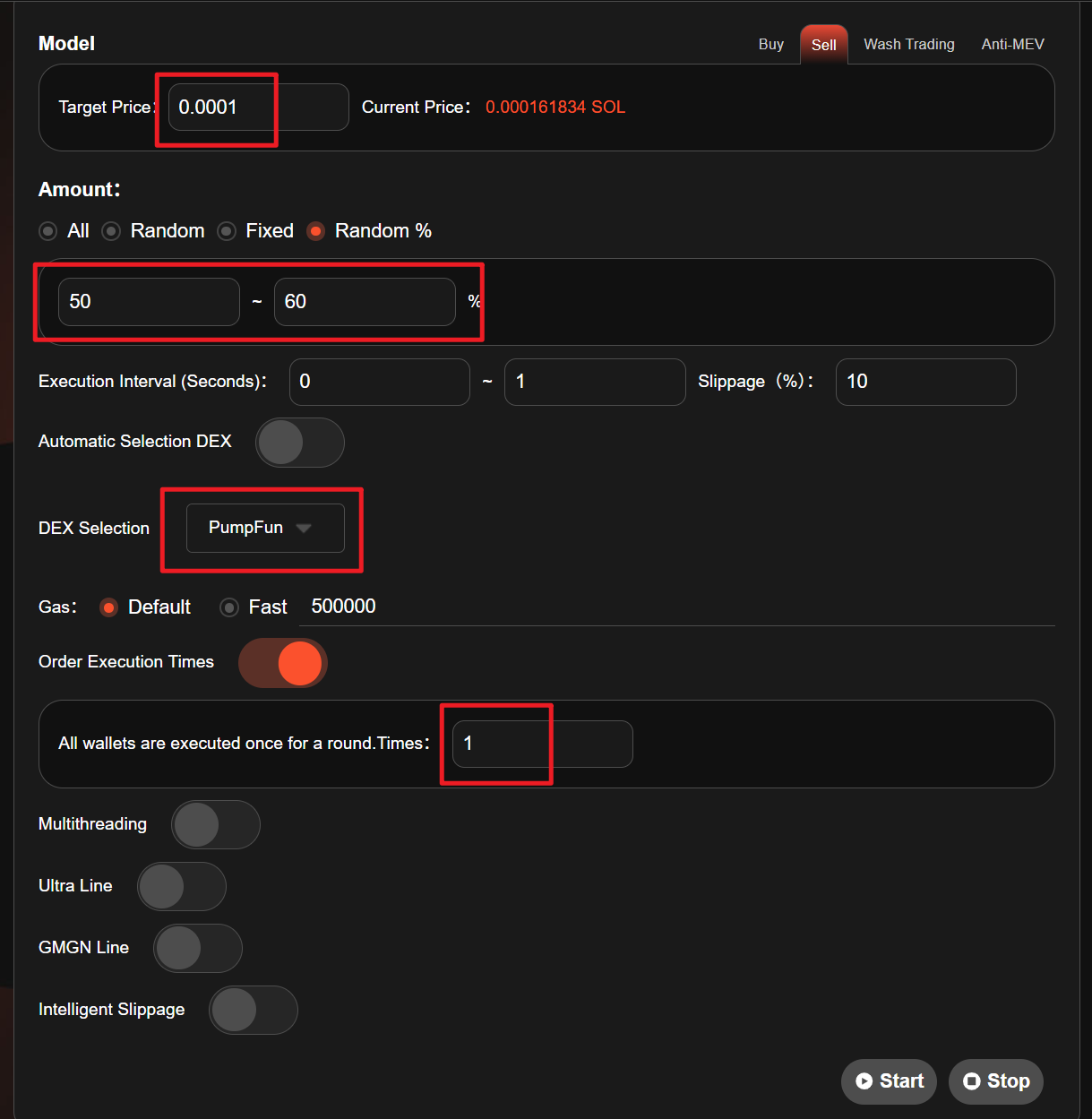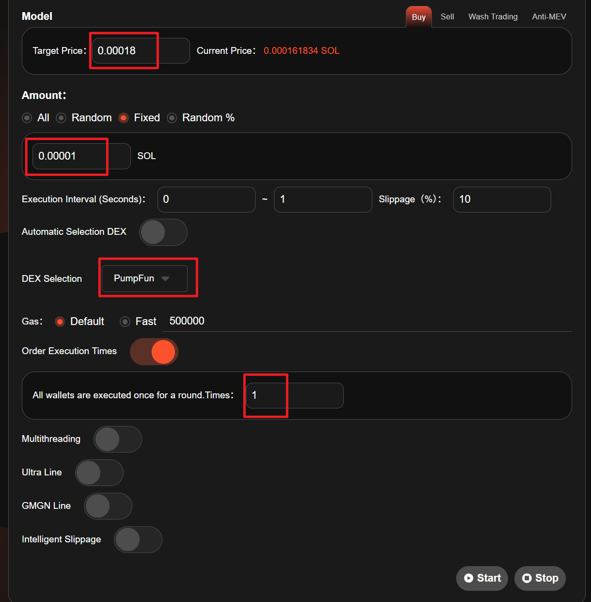 **Order Execution Times:** Customize the number of executions. <mark style="color:purple;">If this is set, the transaction will automatically stop when the specified number of times is reached, without the need for manual interruption.</mark> All wallets are executed once for a round.