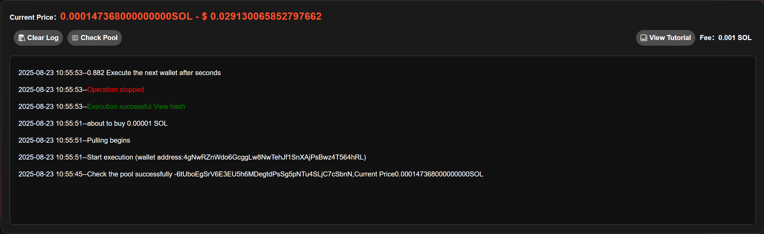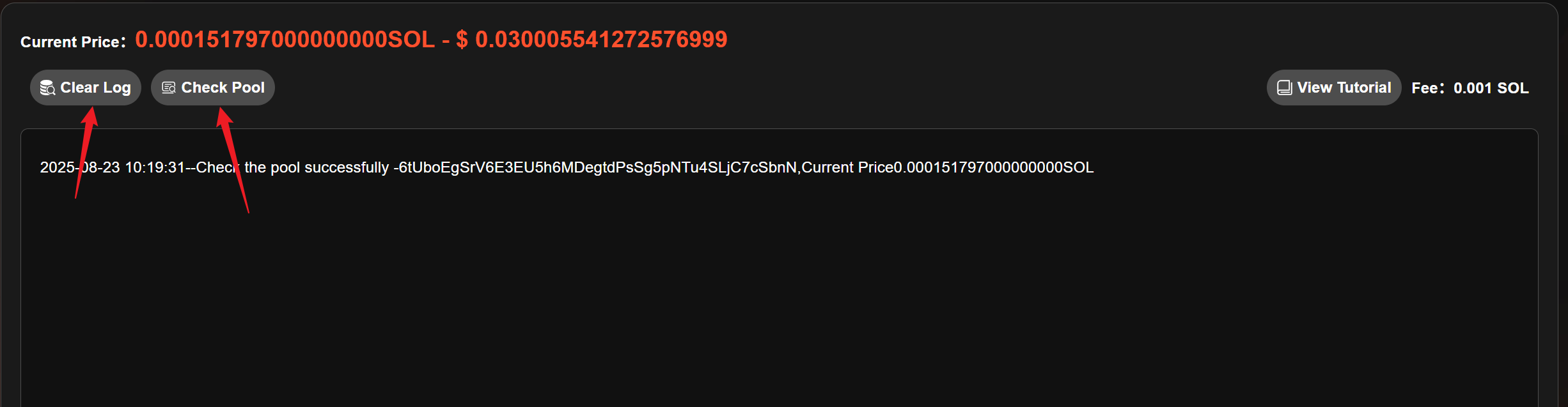 After selecting the token, slide to the log at the bottom of the screen to view the current transaction pool ID and the current price. Click "`Clear Log`" to clear the log information. If you want to confirm the transaction pool ID again after clearing the log, click the "`Check Pool`" button.