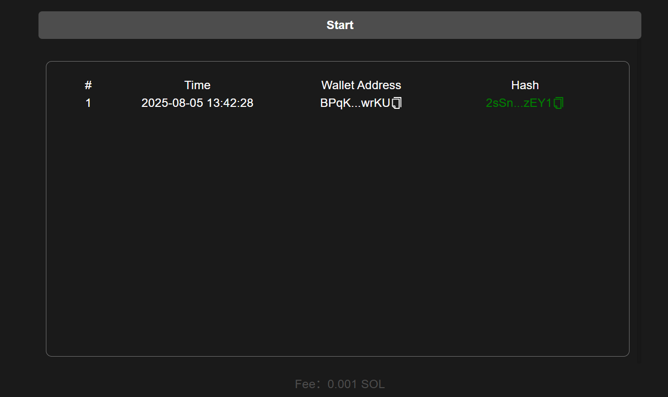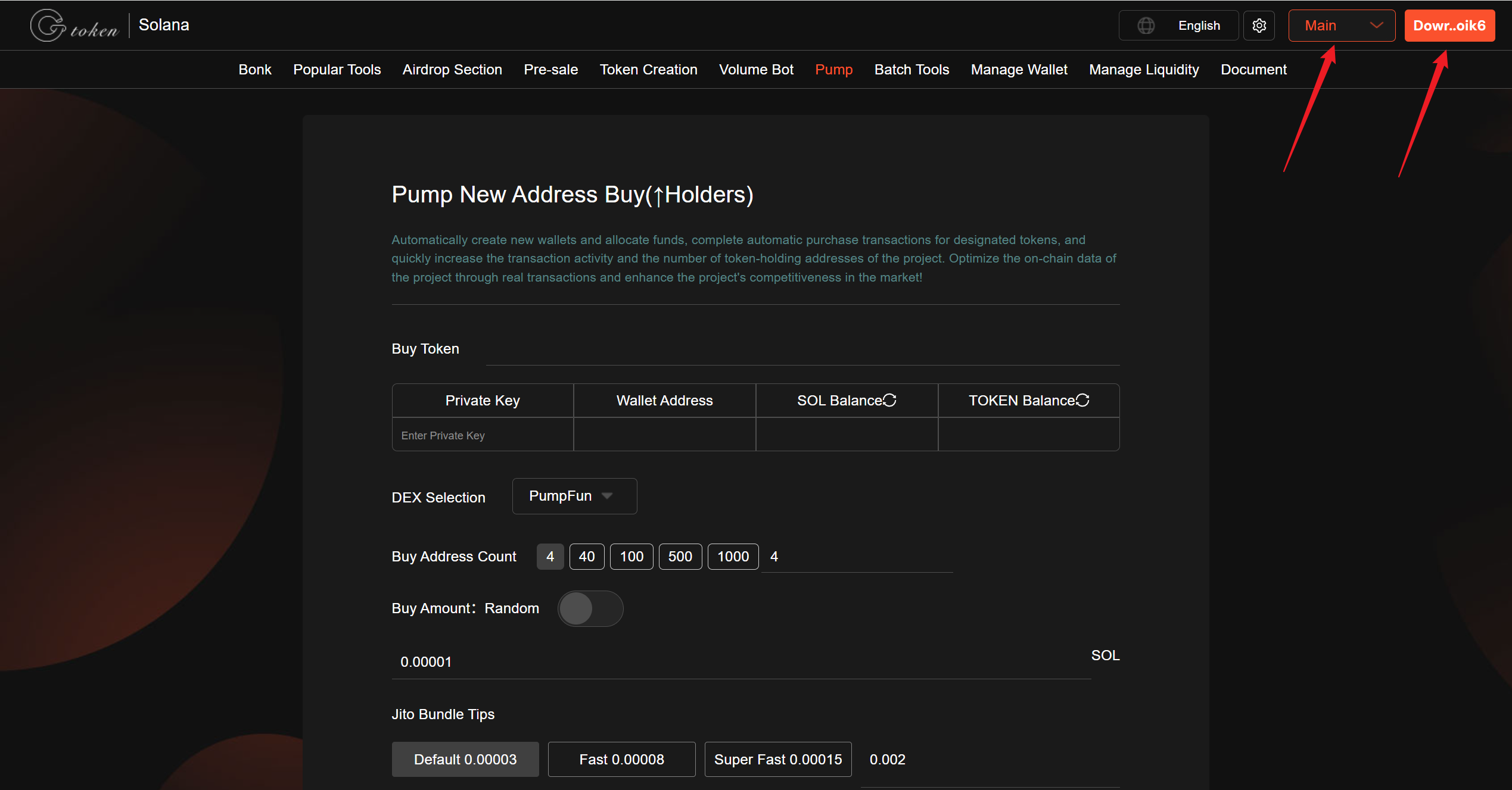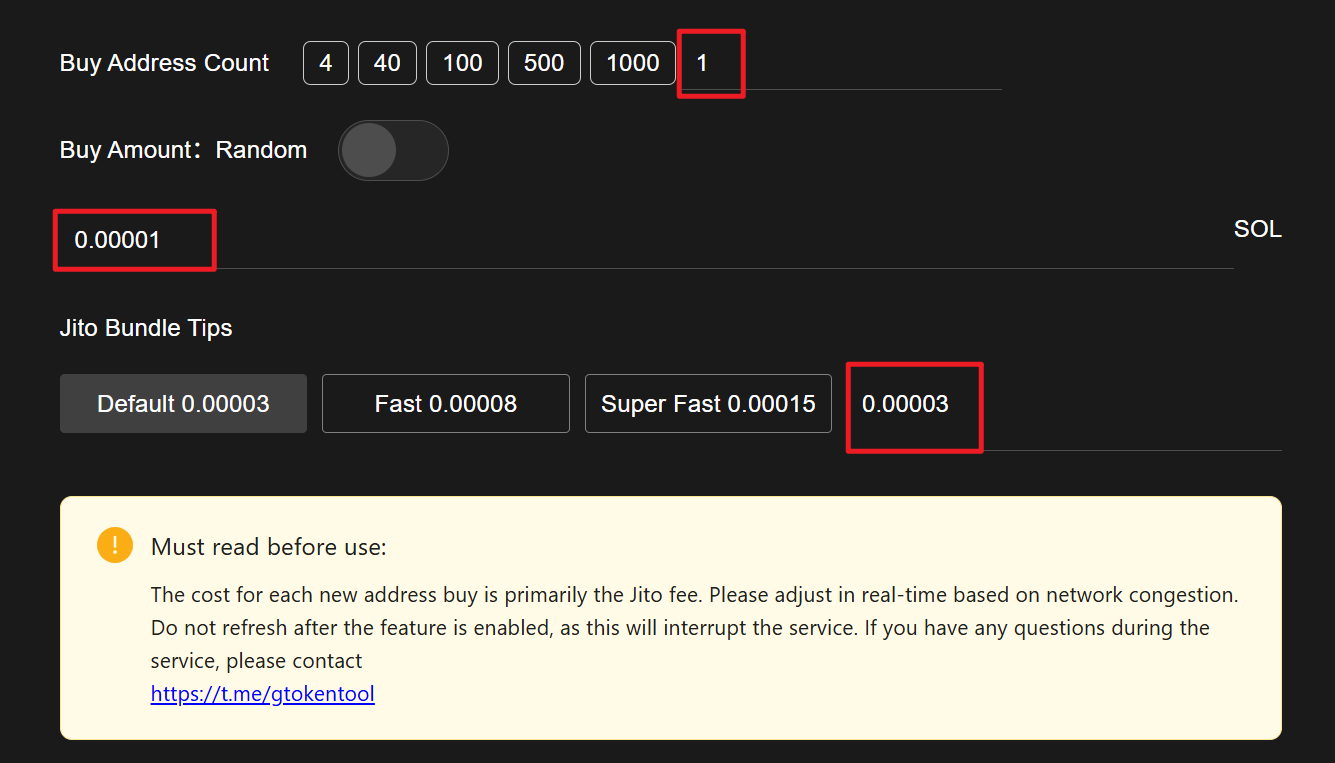 Must read before use:The cost for each new address buy is primarily the Jito fee. Please adjust in real-time based on network congestion. Do not refresh after the feature is enabled, as this will interrupt the service. If you have any questions during the service, please contact <https://t.me/gtokentool>