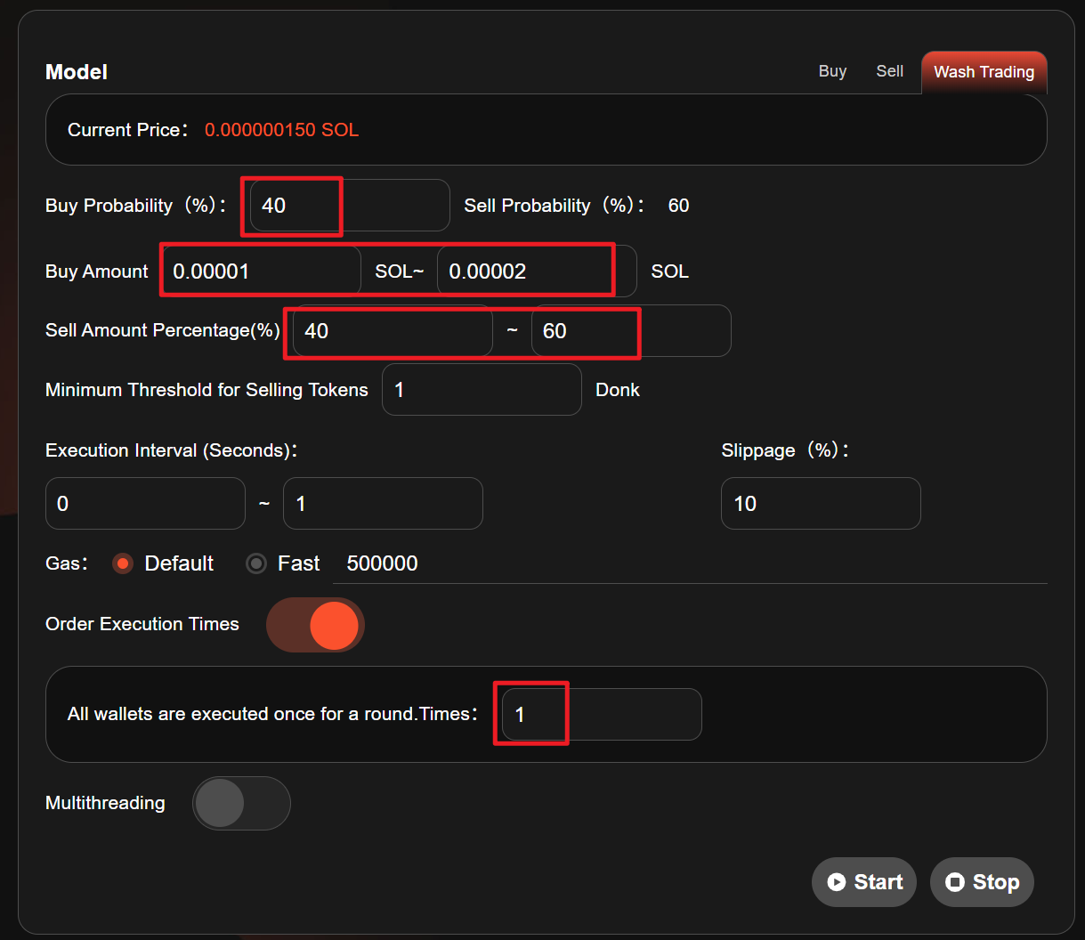 **Order Execution Times:** Customize the number of executions. <mark style="color:purple;">If this is set, the transaction will automatically stop when the specified number of times is reached, without the need for manual interruption.</mark> All wallets are executed once for a round.