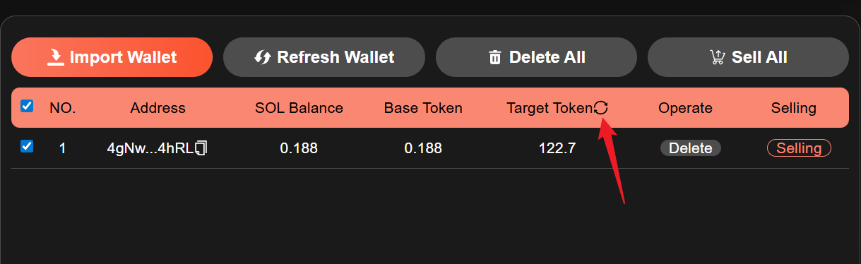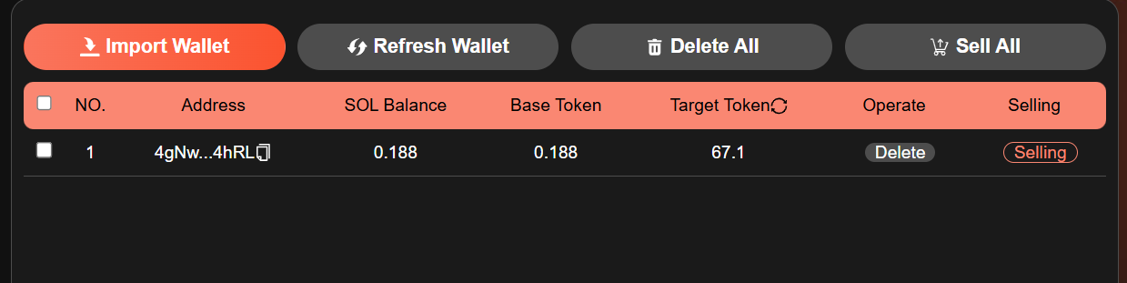Click "`Import Wallet`" to import wallet, then click "`Refresh Wallet`" to refresh the wallet balance. After checking the wallet, clicking "`Sell All`" allows you to directly sell all the target tokens in the selected wallet. If you do not want to use a wallet, you can click the "`Delete`" button to delete the wallet. Click "`Selling`" to sell all the target tokens in the wallet. Clicking the `refresh icon` next to the target token can refresh the balance of the target token in the wallet.