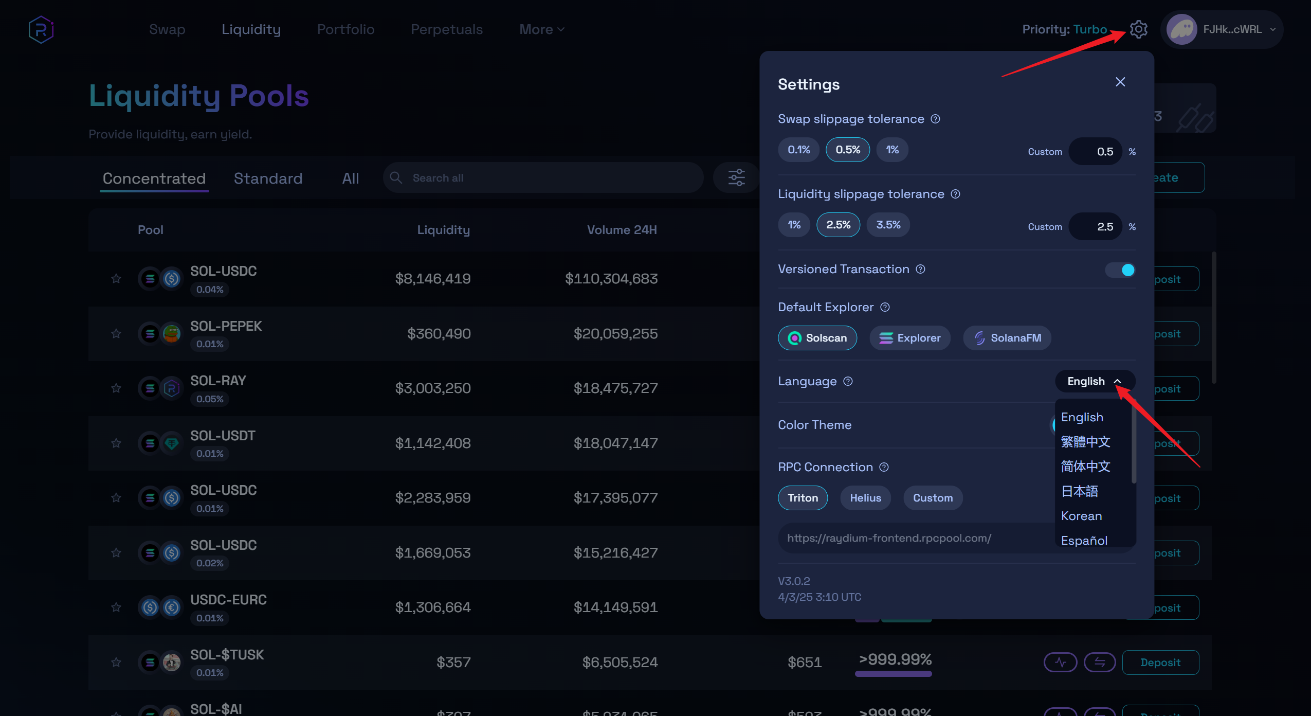 Open the official website of RaydiumV3: <https://raydium.io/liquidity-pools/>, and click the setting in the upper right corner to switch the language: