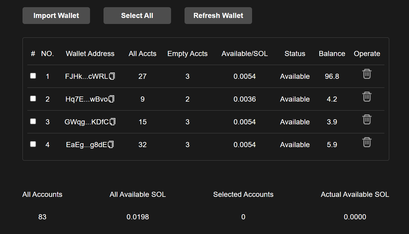 5. Each address requires 0.00001 GAS. You can only recycle when the balance is greater than 0.001 SOL. It is recommended to use a wallet for proxy payment, and all GAS will be paid by the proxy payment wallet.