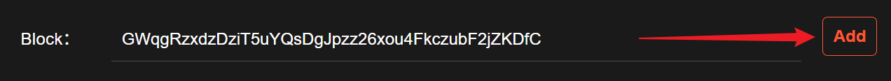 **Block**: You can freeze any address so that it cannot be transferred or sold. Enter the wallet address and only one address can be entered at a time. Click "`Add`" on the right to add the wallet address to the blacklist.