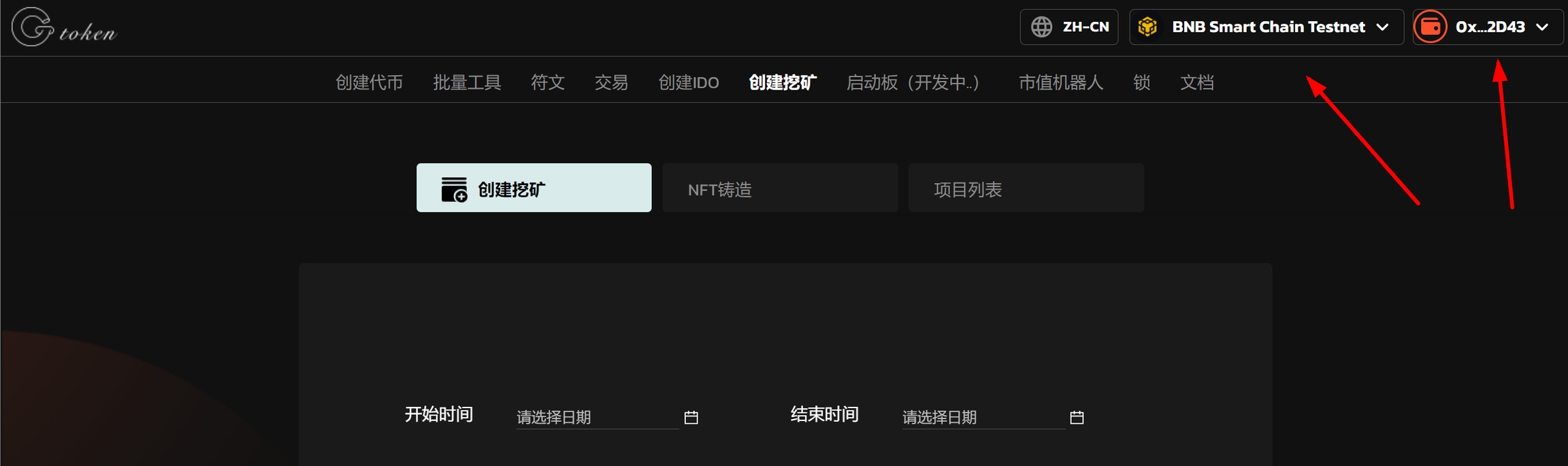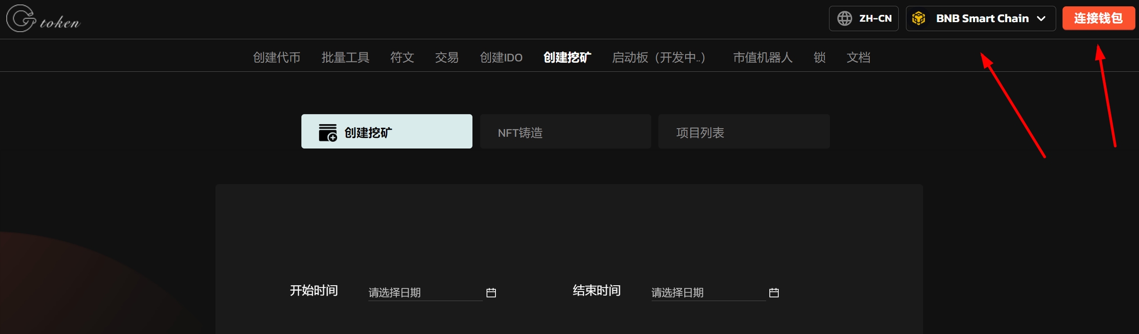 Enter the creation page: https://gtokentool.com/mining,Click on the upper right corner, connect to MetaMask Wallet, and switch to the main network (using BSC test network as an example).