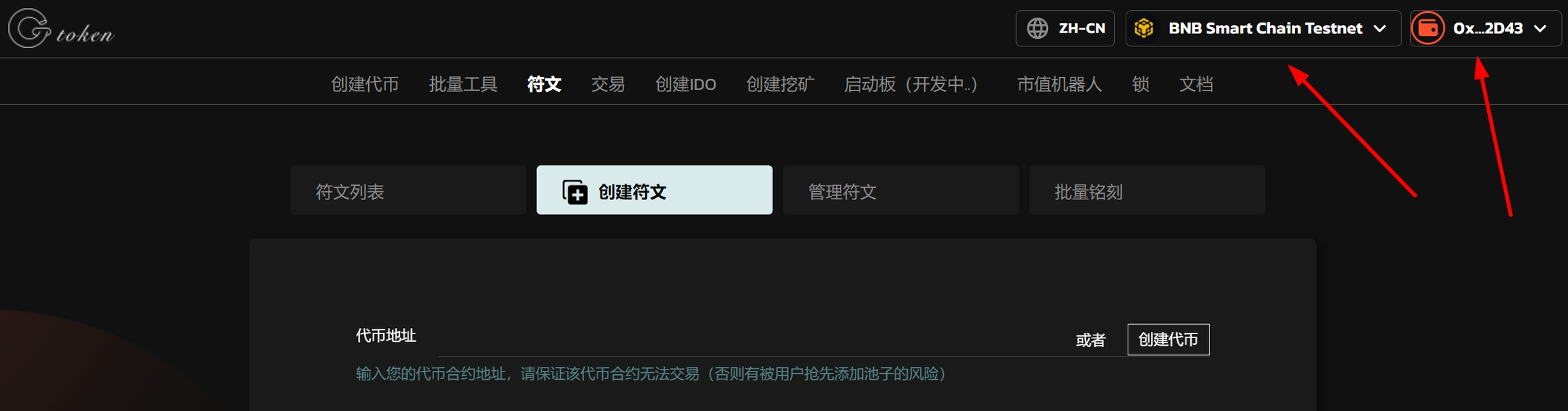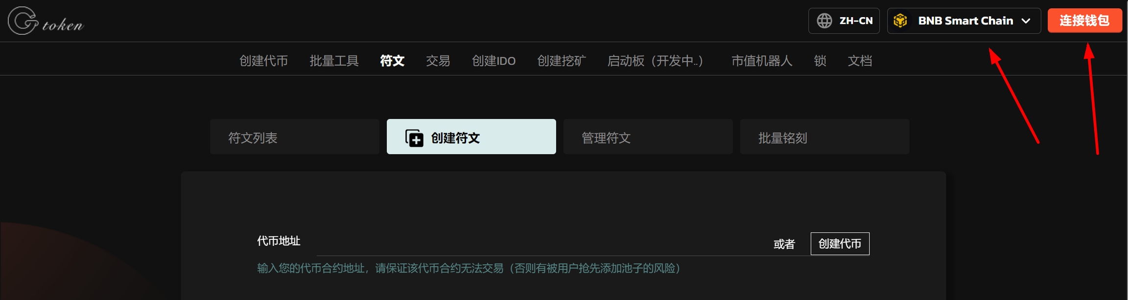 Enter the creation page: https://gtokentool.com/createInscription,Click on the upper right corner, connect to MetaMask Wallet, and switch to the main network (using BSC test network as an example).