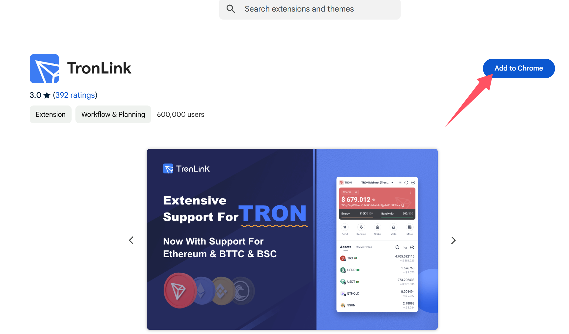 Open TronLink's official website: https://www.tronlink.org, click the Google Chrome icon, and you will be redirected to the plugin installation address.