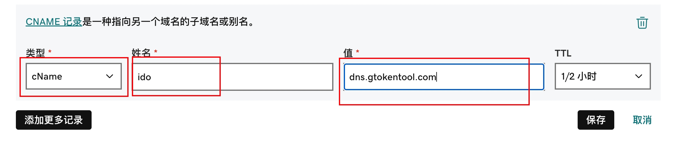 タイプ選択 cName、名前入力 ido、値入力dns.gtokentool.com
