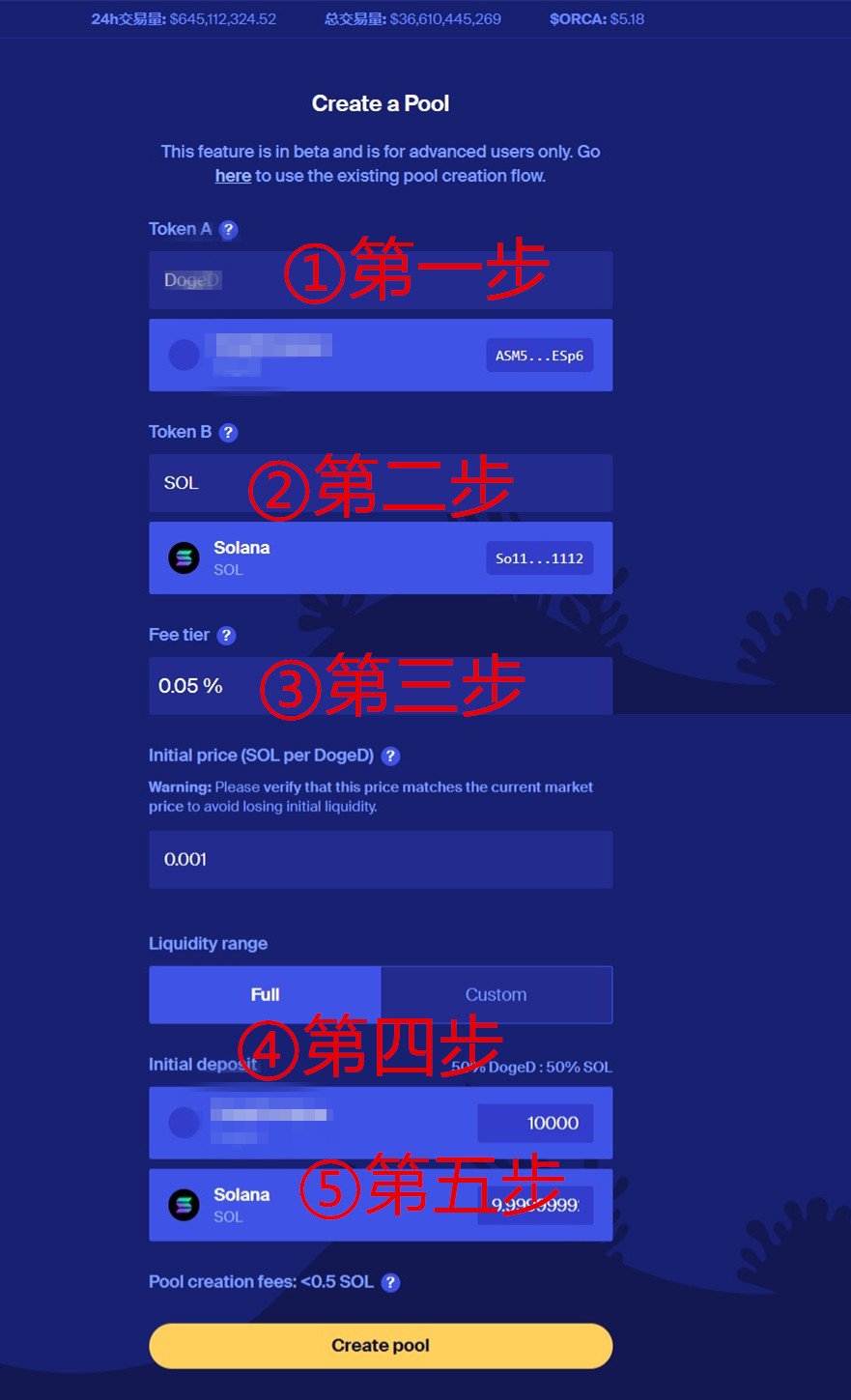 OrcaはSolチェーン上で比較的知名度のある去中心化取引所の1つであり、Raydiumと比較して、Orcaで流動性を構築するために必要なコストは非常に低い（通常 0.5sol 未満）です。また、USDCのプールを作成するのがOrcaでは習慣的であり、USDCのプールの無料損失はSOLのプールよりも低いため、Sol 価格の変動によるリスクを心配する必要はありません。 次に、Orcaを使用して流动性資金プールを作成する方法をお教えします： ウェブページを開く：<https://www.orca.so/create-pool>，必要なトークン情報を入力してください：