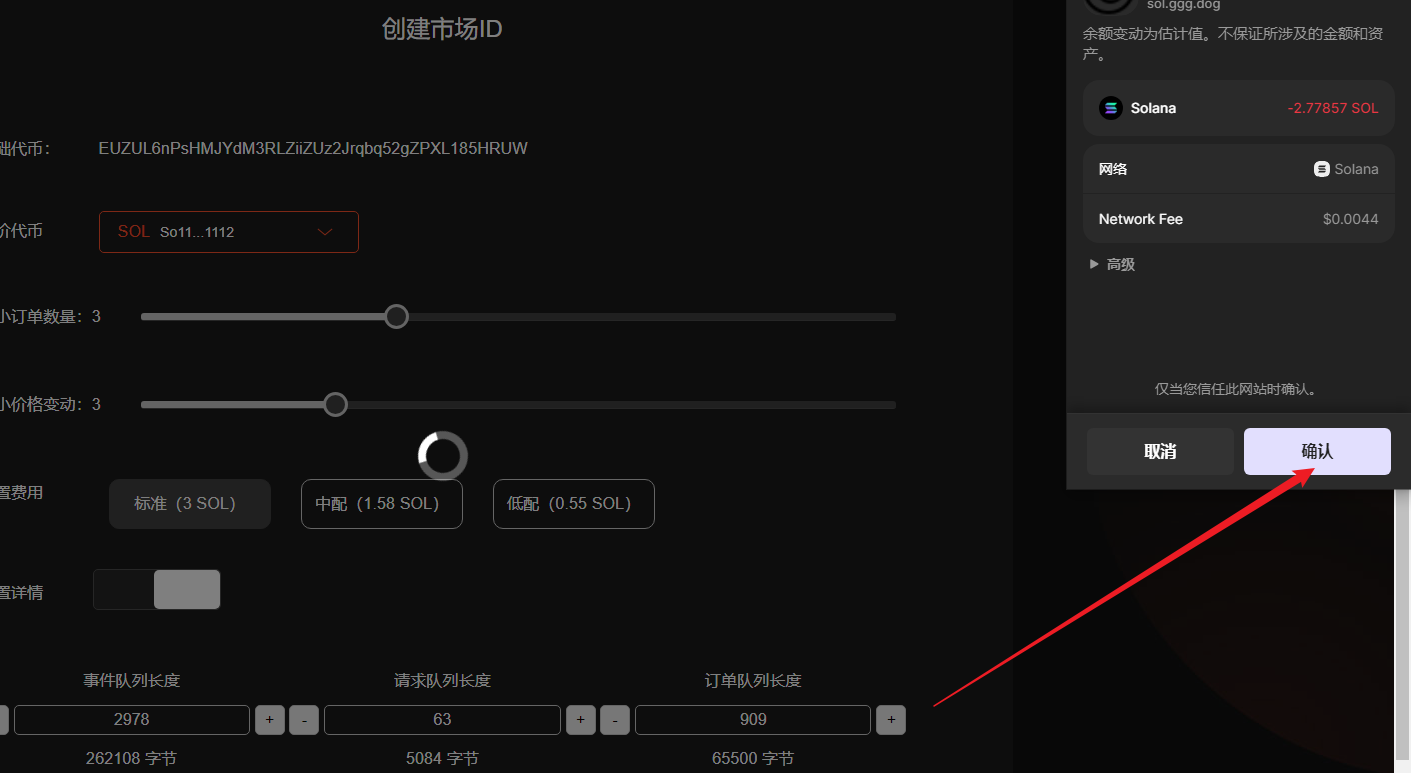 #### 5. すべてのパラメータを入力完了したら、市場 IDを作成できます。IDの作成にはウォレットの確認が必要で、最初はトークンアカウントの作成、次にIDの作成ですので、最初のステップをクリックしたらすぐにページを閉じないでください。