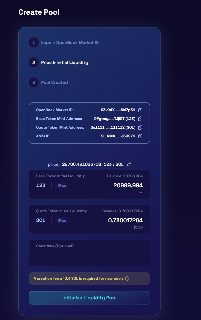 * 取引を確認後、新しいLPが作成され、新しいAMM IDを取得し、底池は設定された開始時間に開始されます。