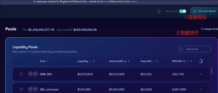 OpenBook 市場を创建した後、Raydium V2のプールページに移動してください：<https://v2.raydium.io/pools/> ページの右上隅でウォレットを接続するをクリックし、「プールを作成」（Create Pool）ボタンを選択してください。