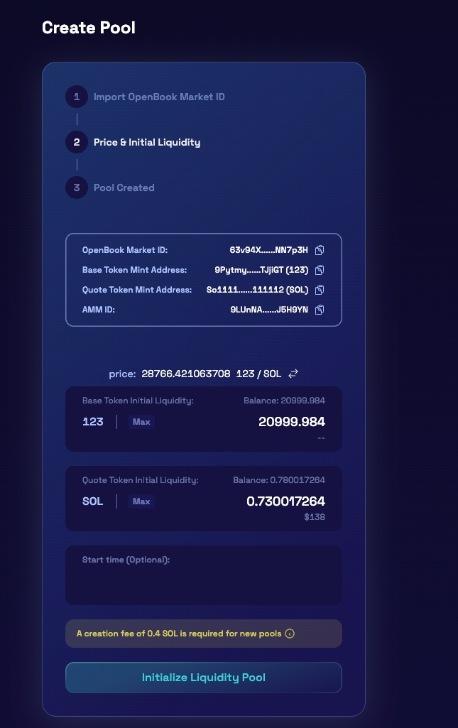 重要な注意:プールを確認および初期化した後、開始価格、流動性、または開始時間の編集はできなくなります。注意してください、開始時間はチェーン上の時間で決定されます。