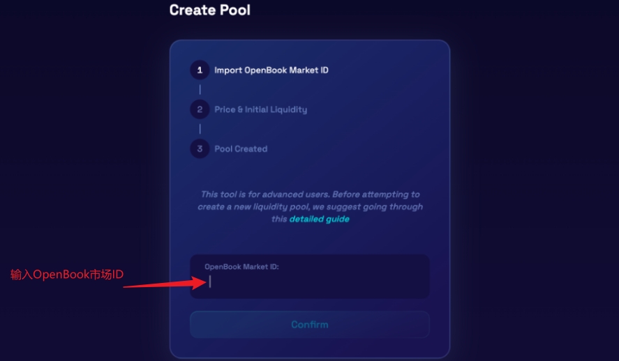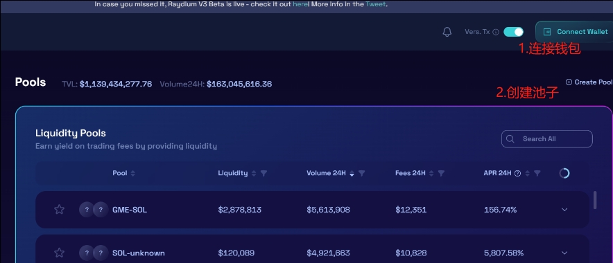 OpenBook 市場を创建した後、Raydium V2のプールページに移動してください:https://v2.raydium.io/pools/ ページの右上隅でウォレットを接続するをクリックし、「プールを作成」(Create Pool)ボタンを選択してください。