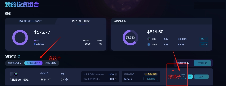 同じようにRaydiumを開き、ページリンク::https://beta.raydium.io/portfolio/ に移動し、「我的投资组合」を見つけ、標準流動プールを選択すると、自分のプールが見られます。