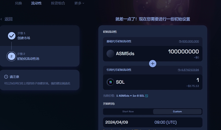 オープン価格:つまりトークンの初期価格であり、あなたのトークン数量とSol 数量に依存します。例えば、私はプールに10 億枚のトークンと1 個のSolを投入した場合、私のオープン価格は以下の通りです:0.00000001sol、USDTに換算すると0.00000182Uです
