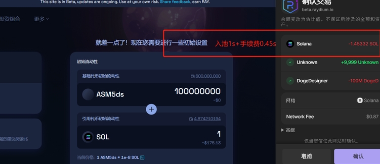 確認が問題ないことを確認したら、初期化流动性をクリックし、ウォレットで支払い料を確認してください。(注意:プール手数料は約 0.2solです。)