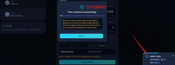 プールの作成が成功した後、以下の図のように通知が表示されます
