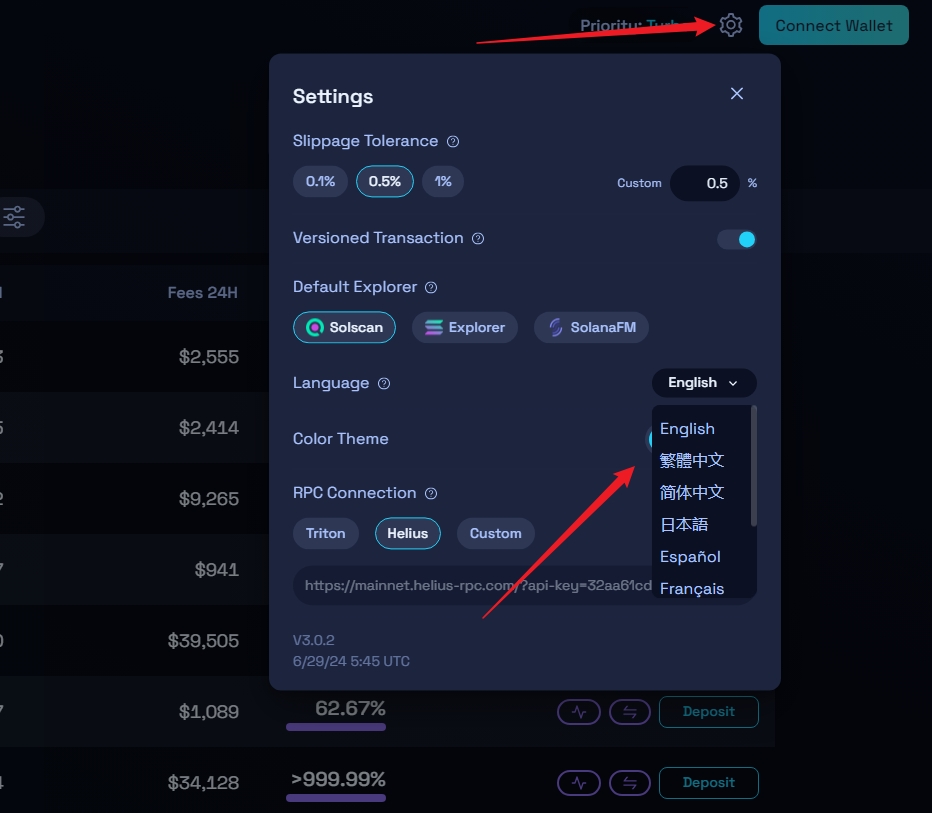 リーダムV3の公式ウェブサイトを開く:https://raydium.io/liquidity-pools/,右上角の設定をクリックして言語を切り替えることができます: