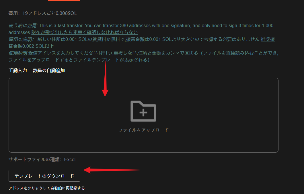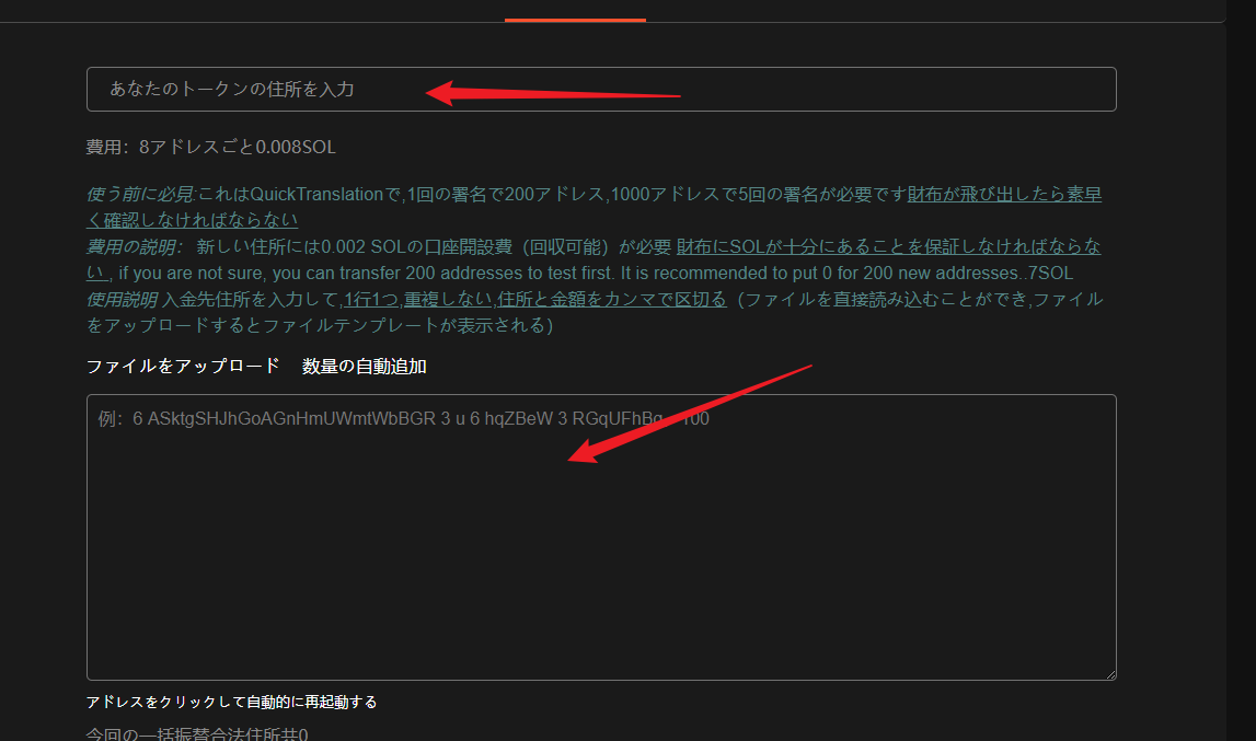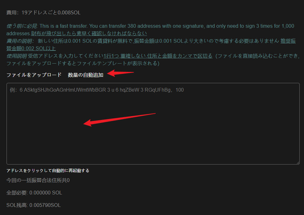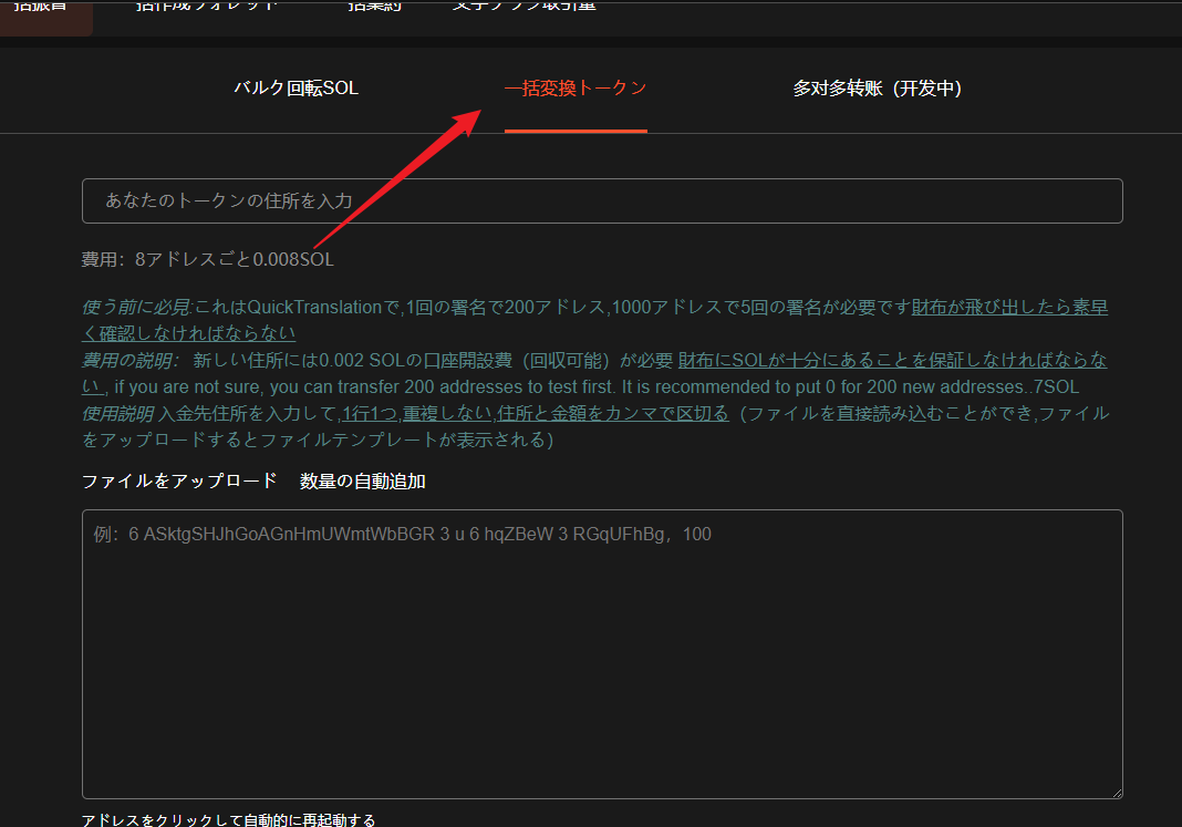 選択“大量のSol”，入力欄に空投するアドレスと数量を入力してください。英語のカンマで区切ります（最大 20 個のアドレスまでです）