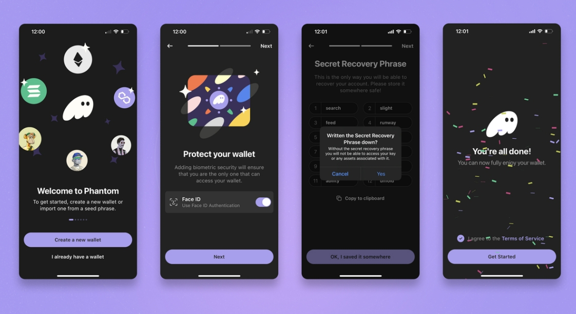 アクセスしてhttps://phantom.app/downloadに、デバイスの種類(iOS/Android)に応じてアプリケーションマーケットを選択してください。デバイスのアプリストアにリダイレクトされ、手順に従ってデバイスにダウンロードおよびインストールしてください。インストール後、アプリを開き、新しいウォレットの設定に進むためにPhantomの初期画面が表示されます。初めてのユーザーの場合は、「新しいウォレットを作成」を選択し、デバイス認証を有効にして(デバイスの種類によって異なる場合があります)、ウォレットを未許可のアクセスから保護してください。Solanaウォレットをお持ちの場合は、「既存のウォレットがある」と選択し、メモリーナップトを入力してウォレットを復元してください。