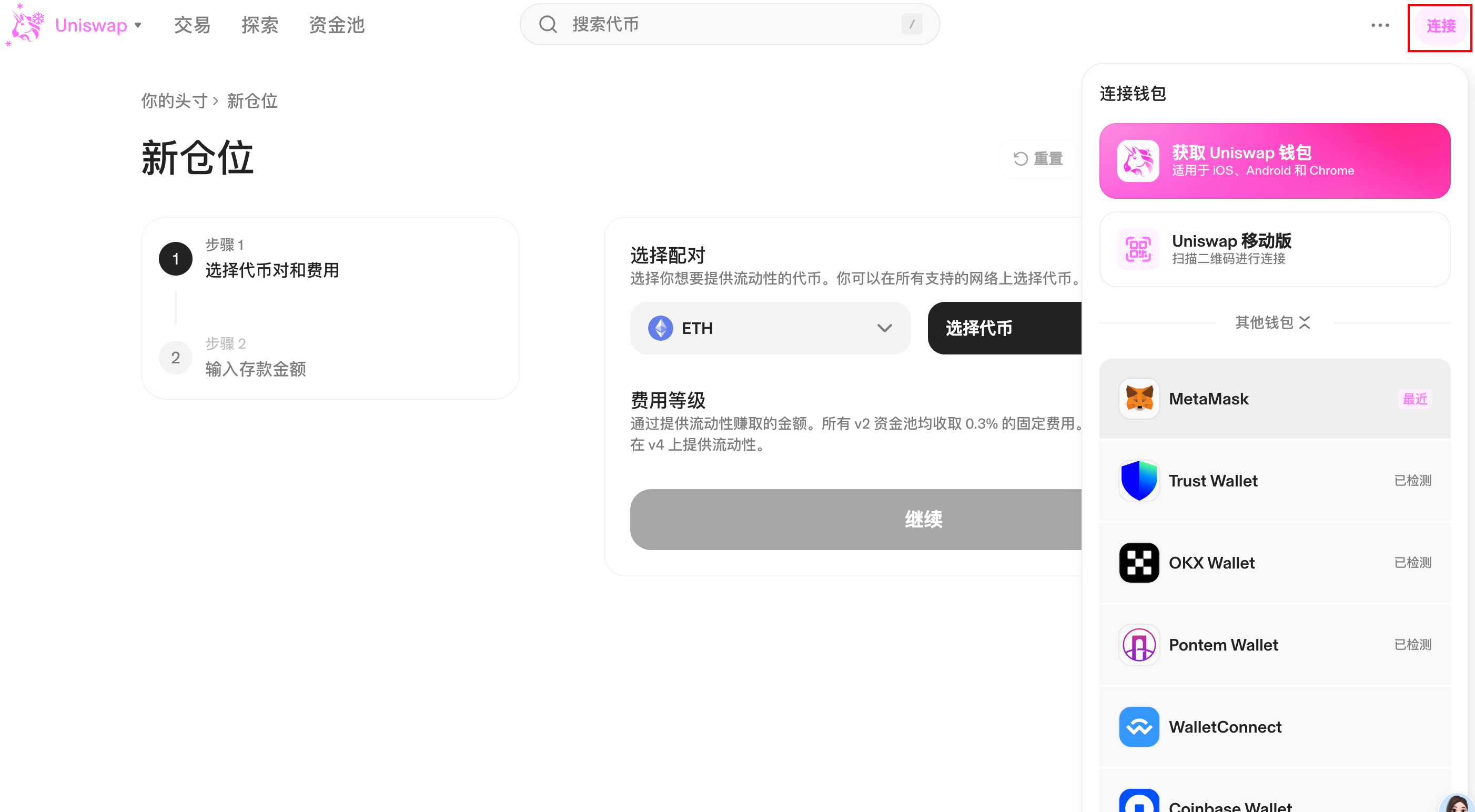### **1.uniswapの流动性官网を開き、右上角の接続ウォレットをクリックしてください**