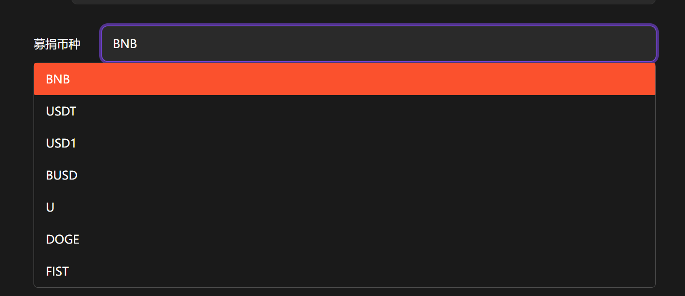 这里我选择BNB，也可以选择其他的币种（USDT、USD1、BUSD、U、DOGE、FIST）。