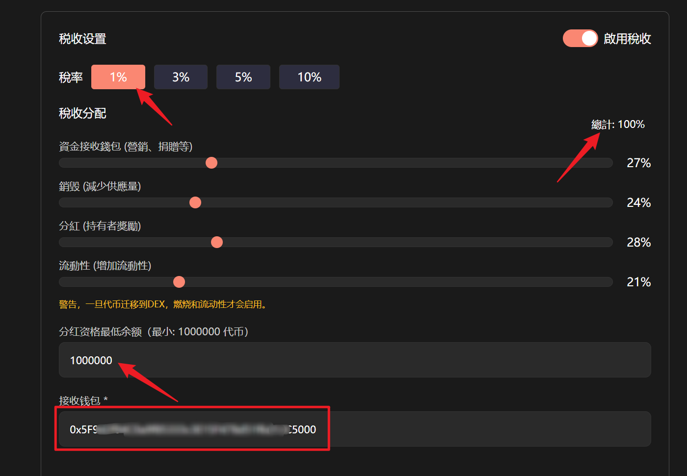 税收分配总计要为100%，可设置分红资格最低余额（最小：1000000 代币）以及接收钱包。
