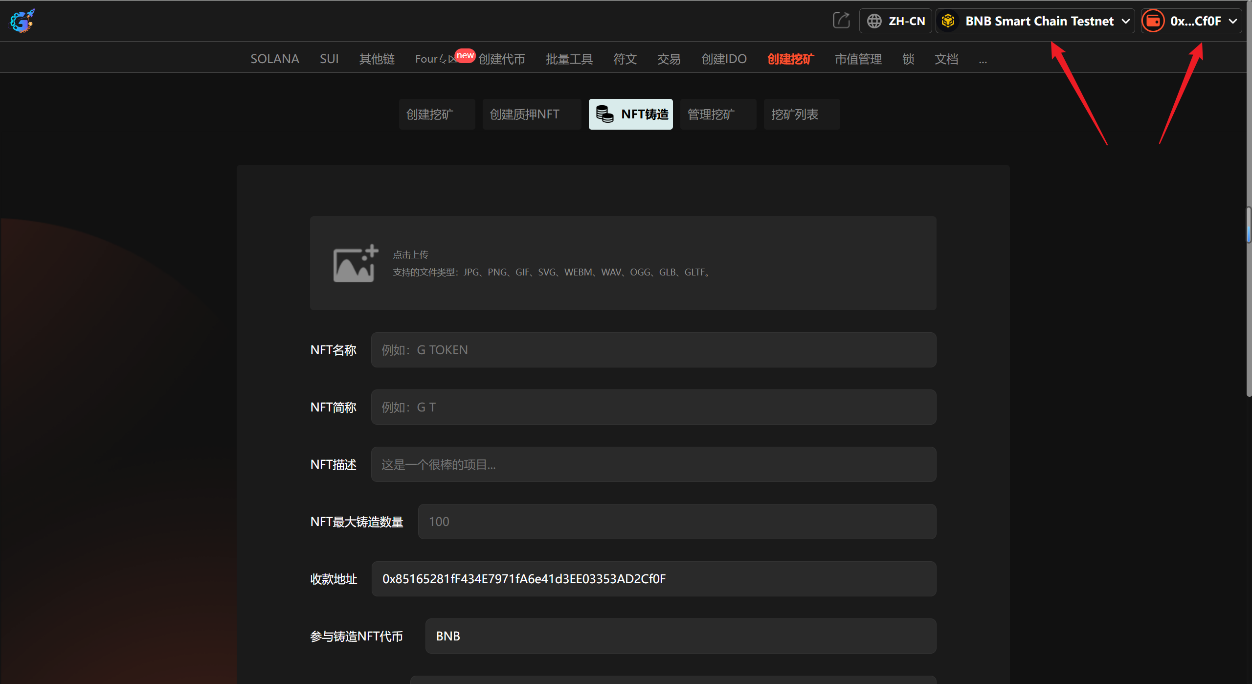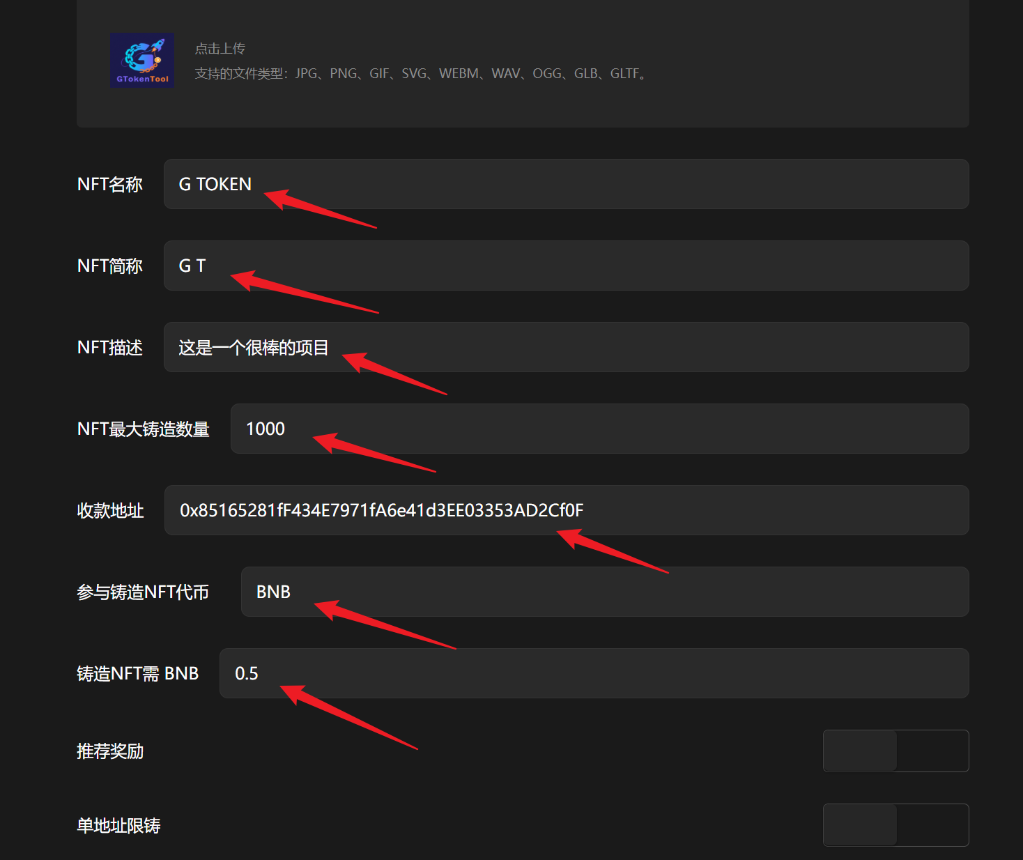 假设我们创建一个叫“G TOKEN”的NFT铸造,填写如下: