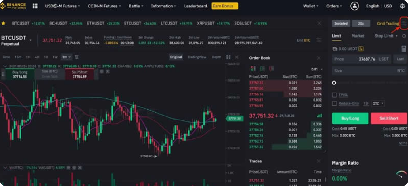 1、打开币安交易所(点此注册)，并前往合约交易介面。点击\[交易规则]。
