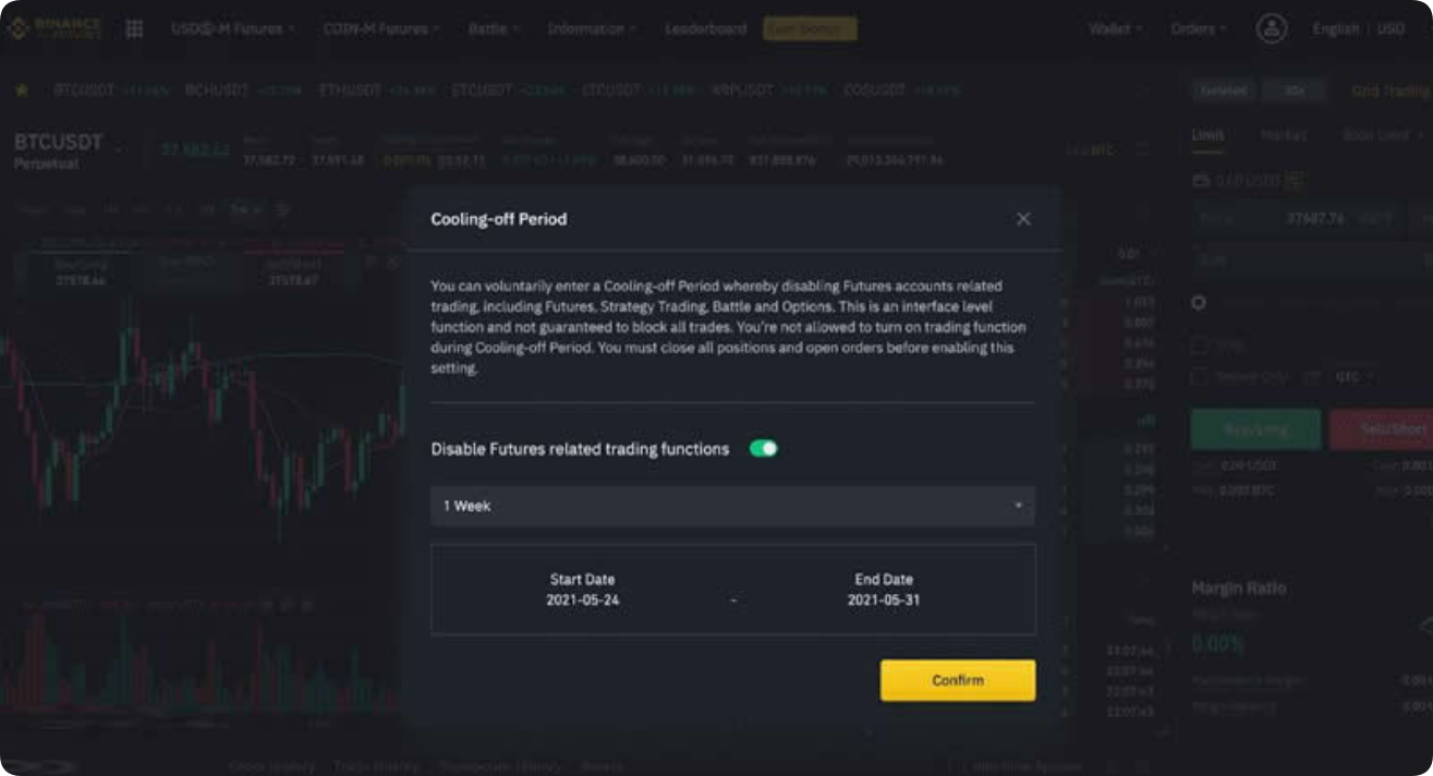 3、详细阅读功能说明。点击以切换\[停用合约相关交易功能]按钮。接下来，选择冷静期的持续期间，然后点击\[确认]启用。