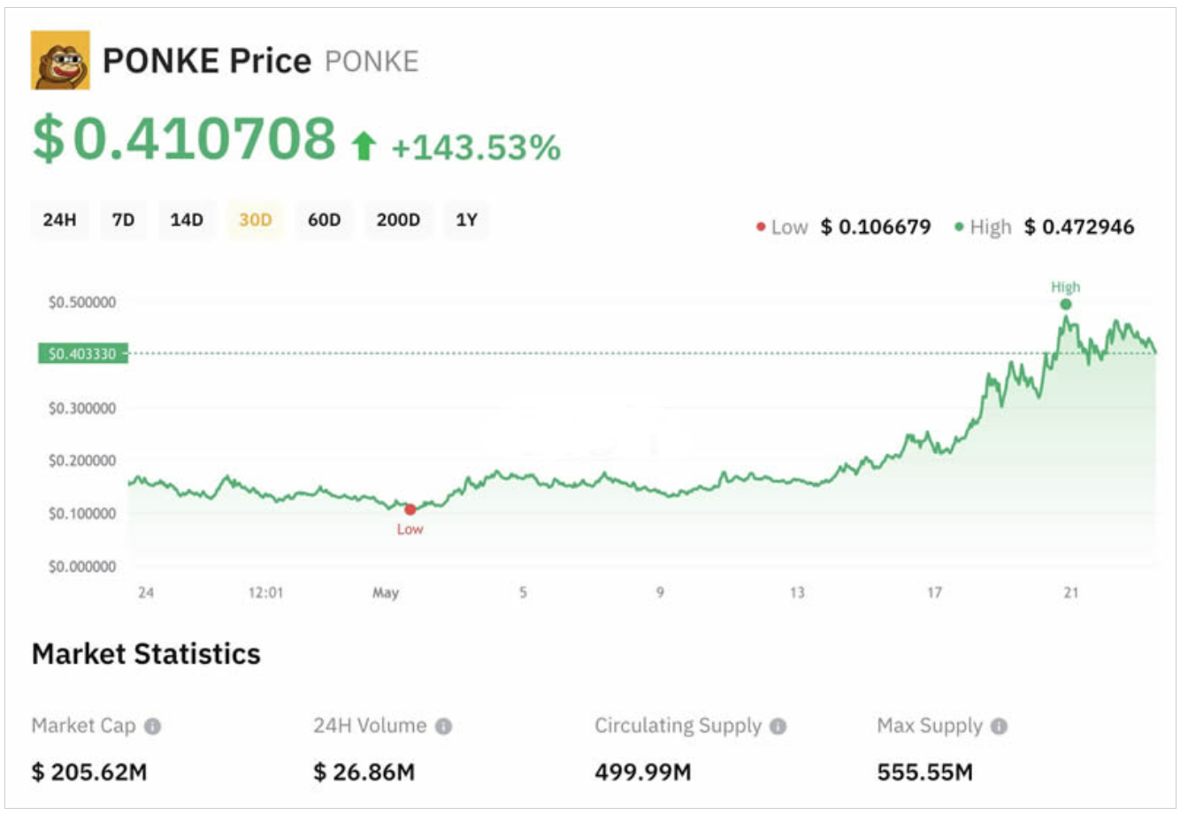 Ponke代币于2023年底上线，已获得包括Crypto Rover、Jake Gagain和传奇比特币投资者Davinci Jeremie在内的多位加密货币网红的认可。这些代币助推了对代币的强烈热议：尽管自推出以来已有近半年的短期本地化下跌，但它仍然是为数不多的长期上行趋势的模因币之一。此外，从5 月中旬开始，PONKE 的价格进一步飙升，在一周内突破近200% 的记录。