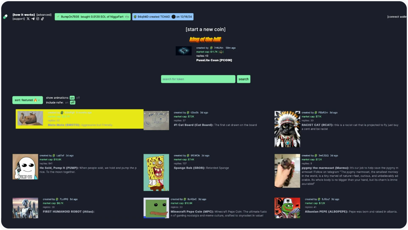 代币在特定市值阈值（例如 Solana 上的 69,000 美元）达到“King of the Hill”状态 。
