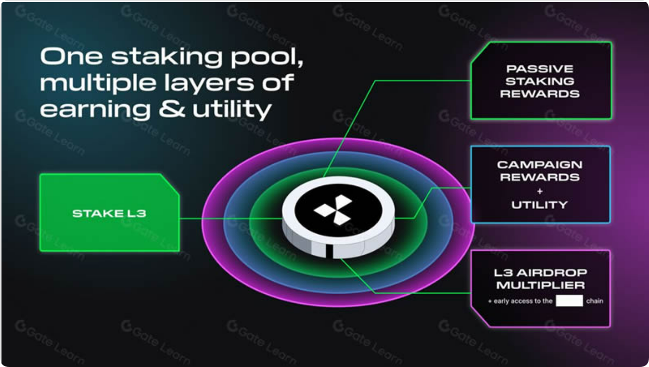 发布原生代币L3的同时，团队推出了新经济模型—L3的三层质押模型。分层质押模型的推出目的是通过L3的三层用例来将代币持有者与生态系统的发展联系起来，接下来将详细展开阐述该模型：