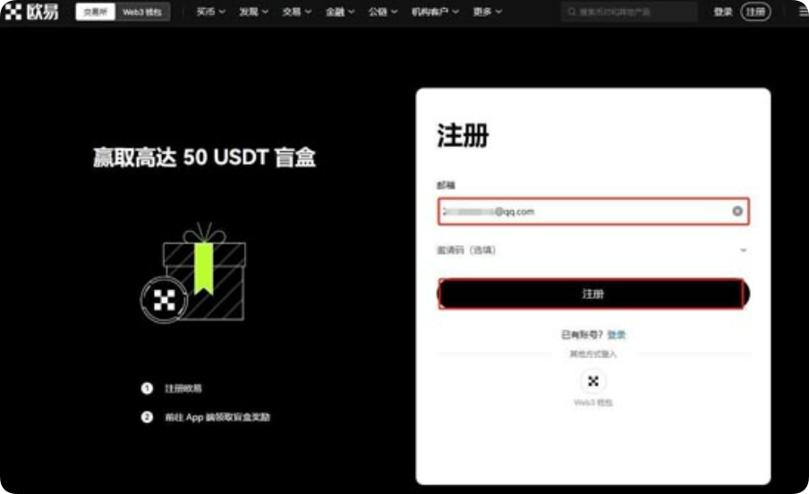 1、点击此处即可打开欧易OKX交易所官网，在首页输入邮箱，点击“注册”