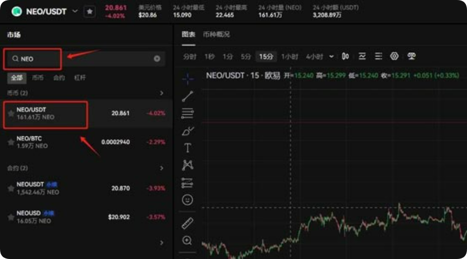 11、在搜索框输入NEO，选择NEO/USDT交易对，可以看到NEO实时行情